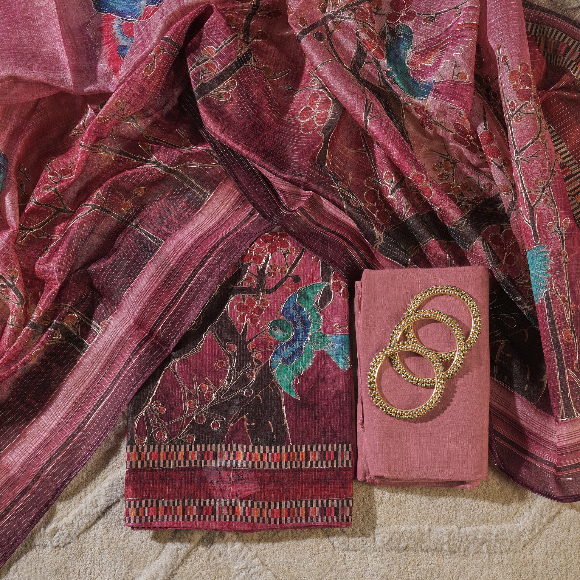 This dress material is perfect for grand occasions. The silk feels rich, and the bird print makes it stand out.