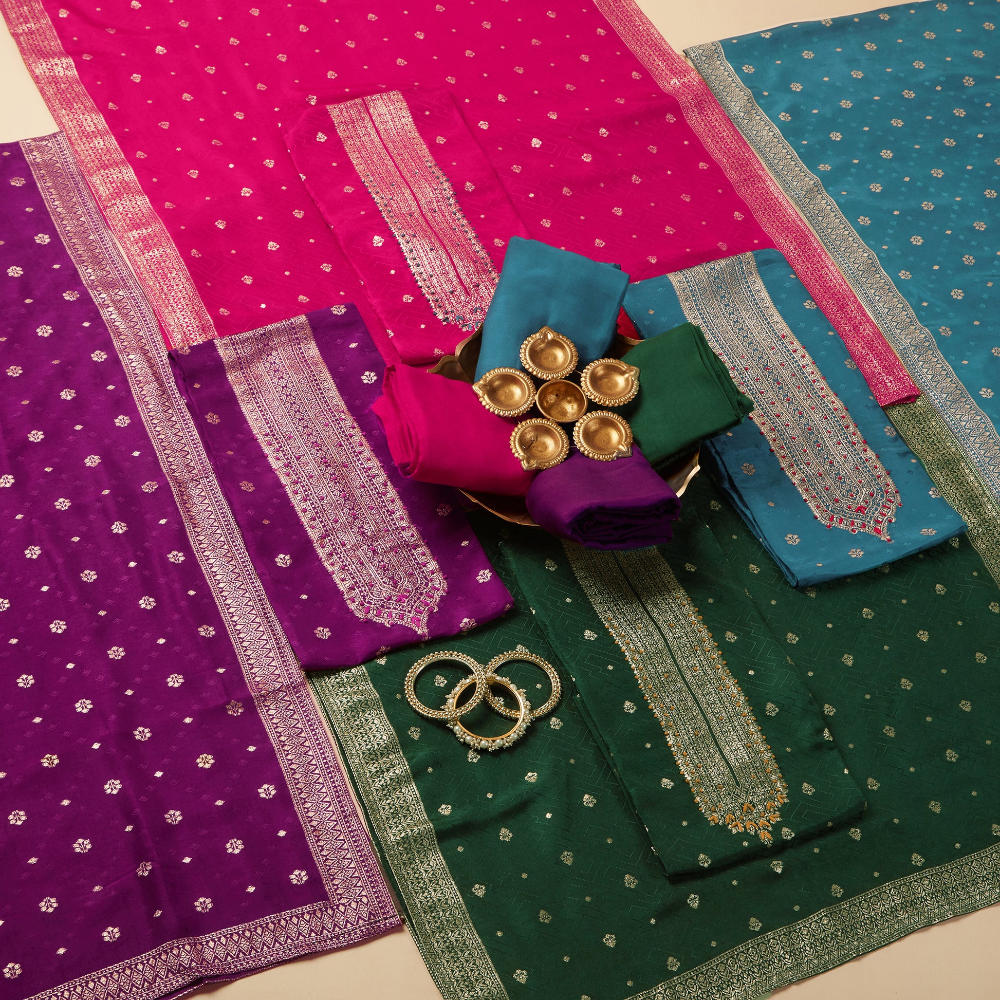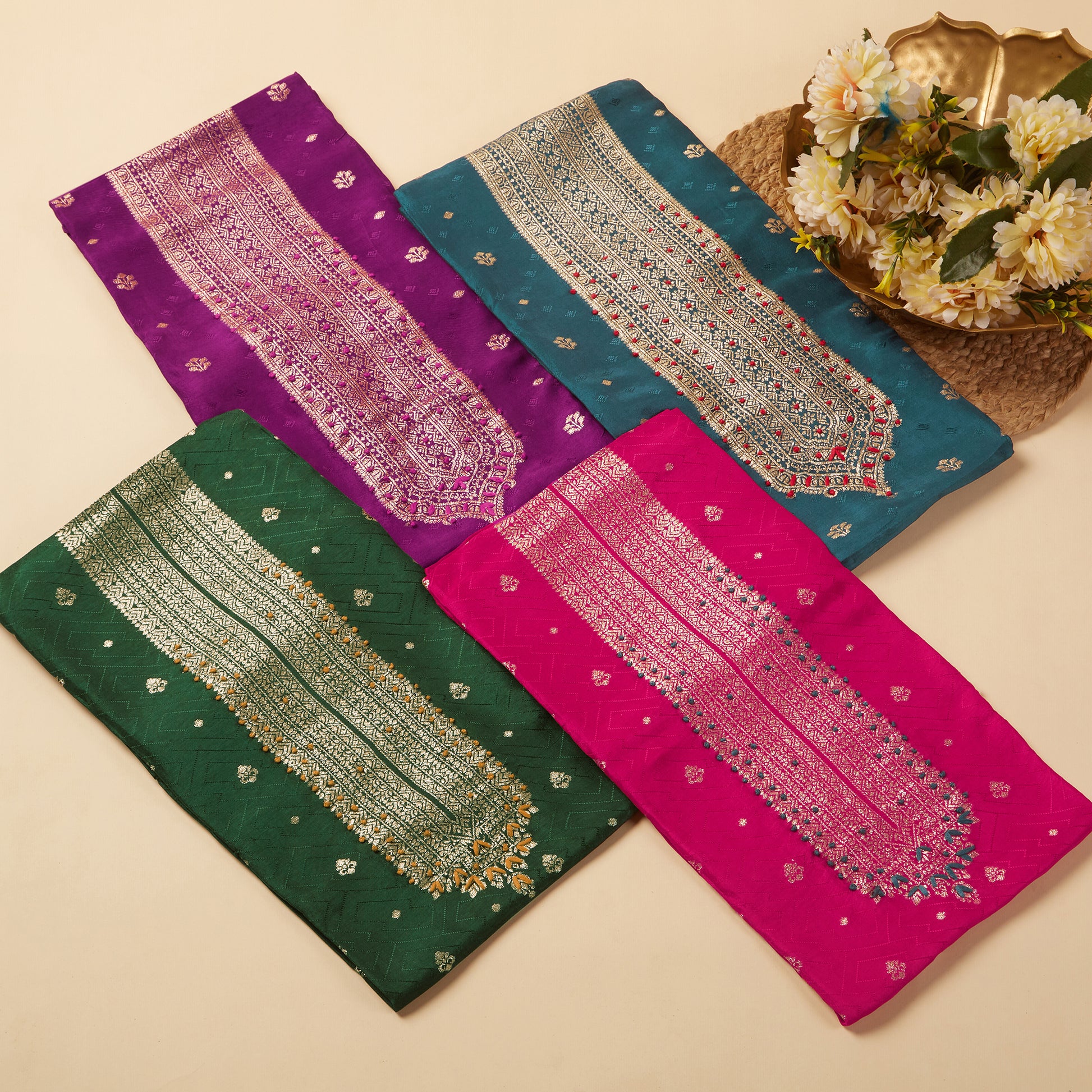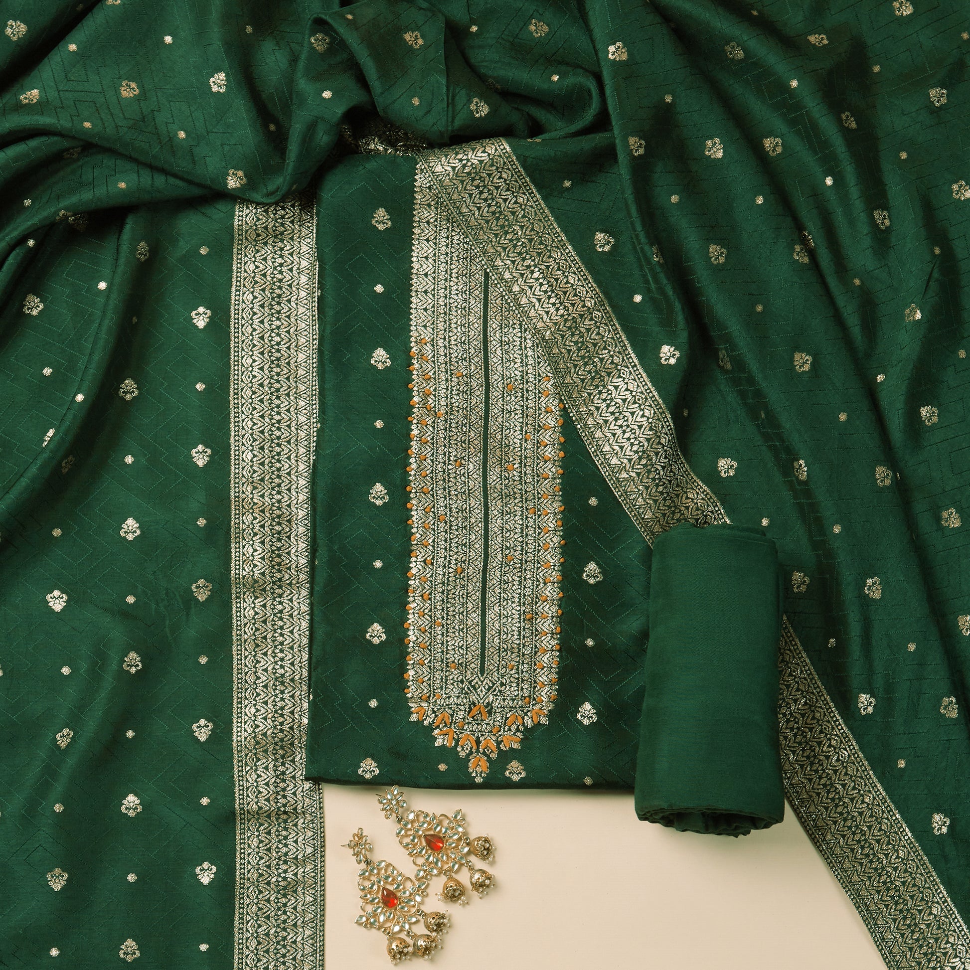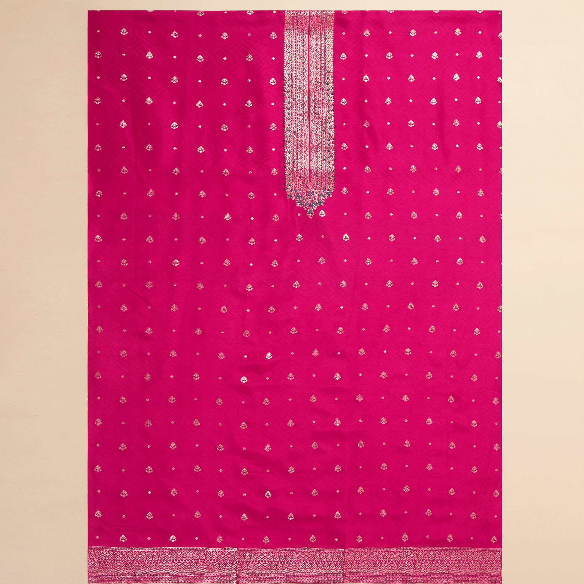 Javer Banarasi Silk Golden Foil Buttis Unstitched 3pcs Suit Set for Women