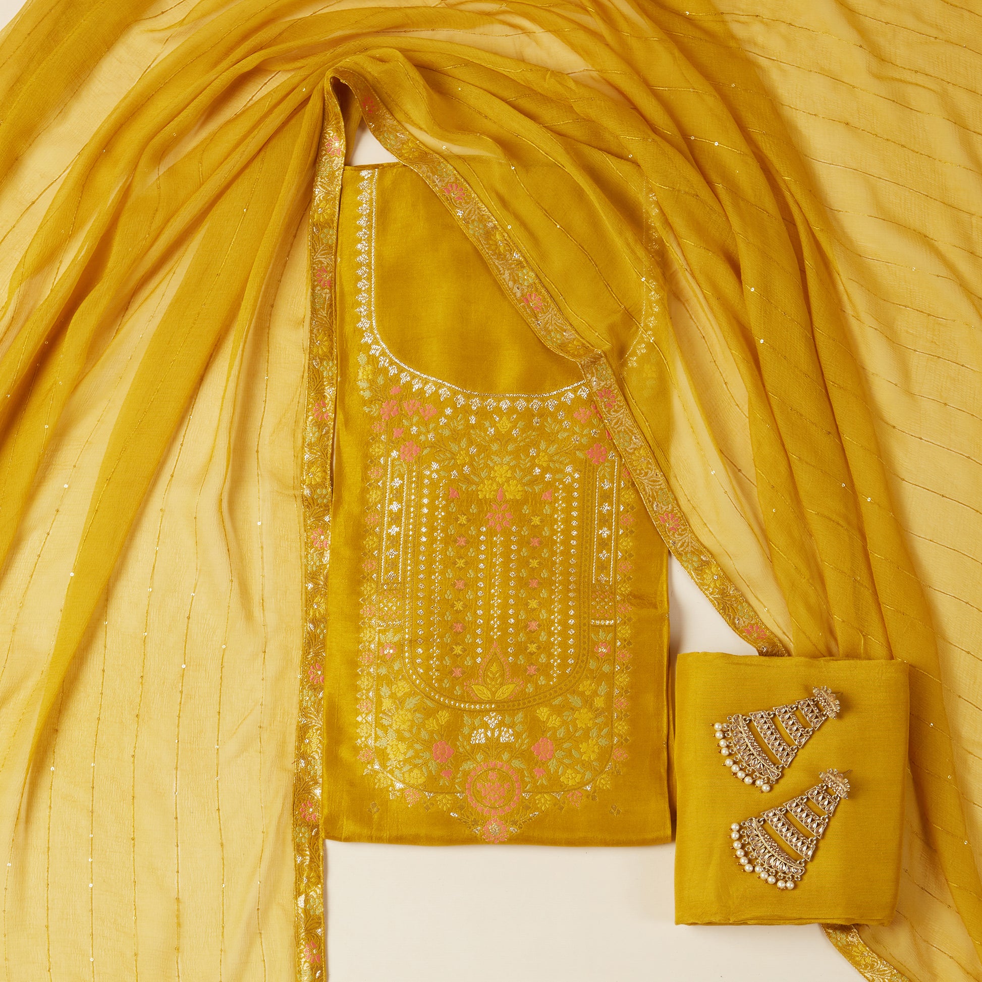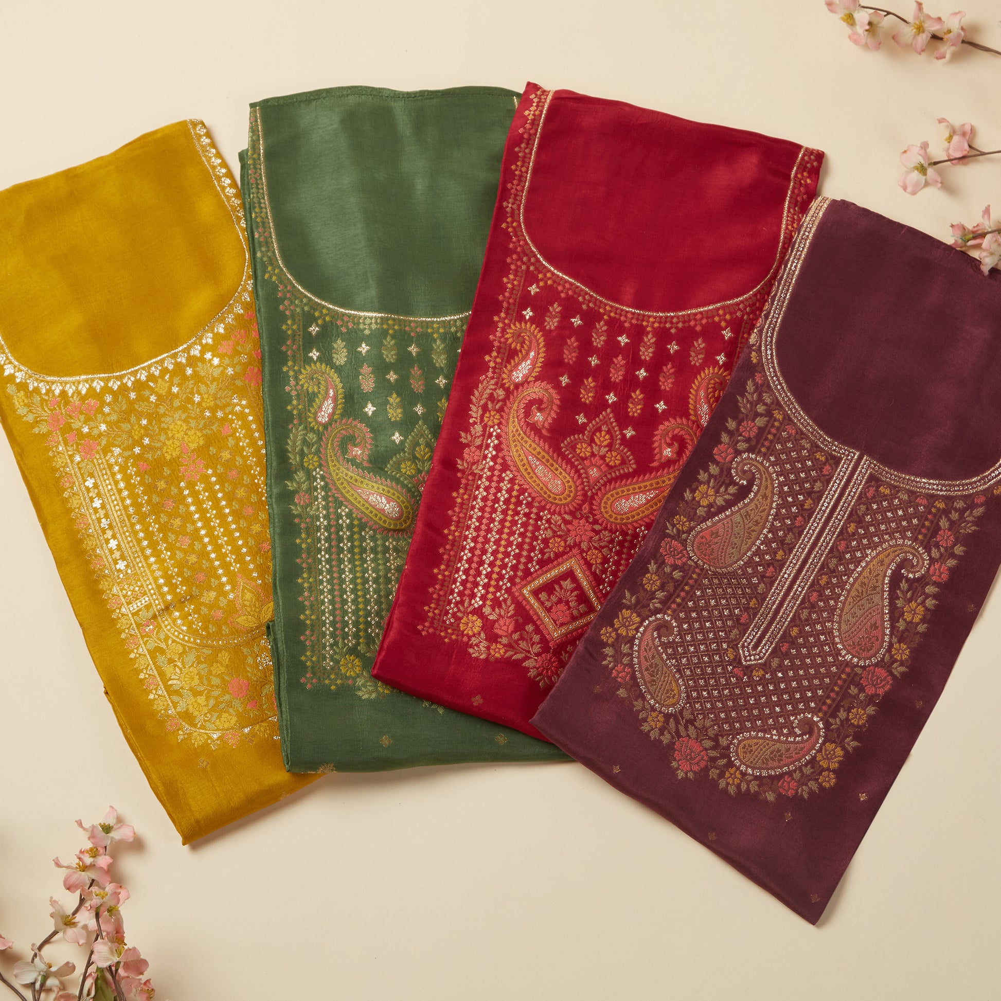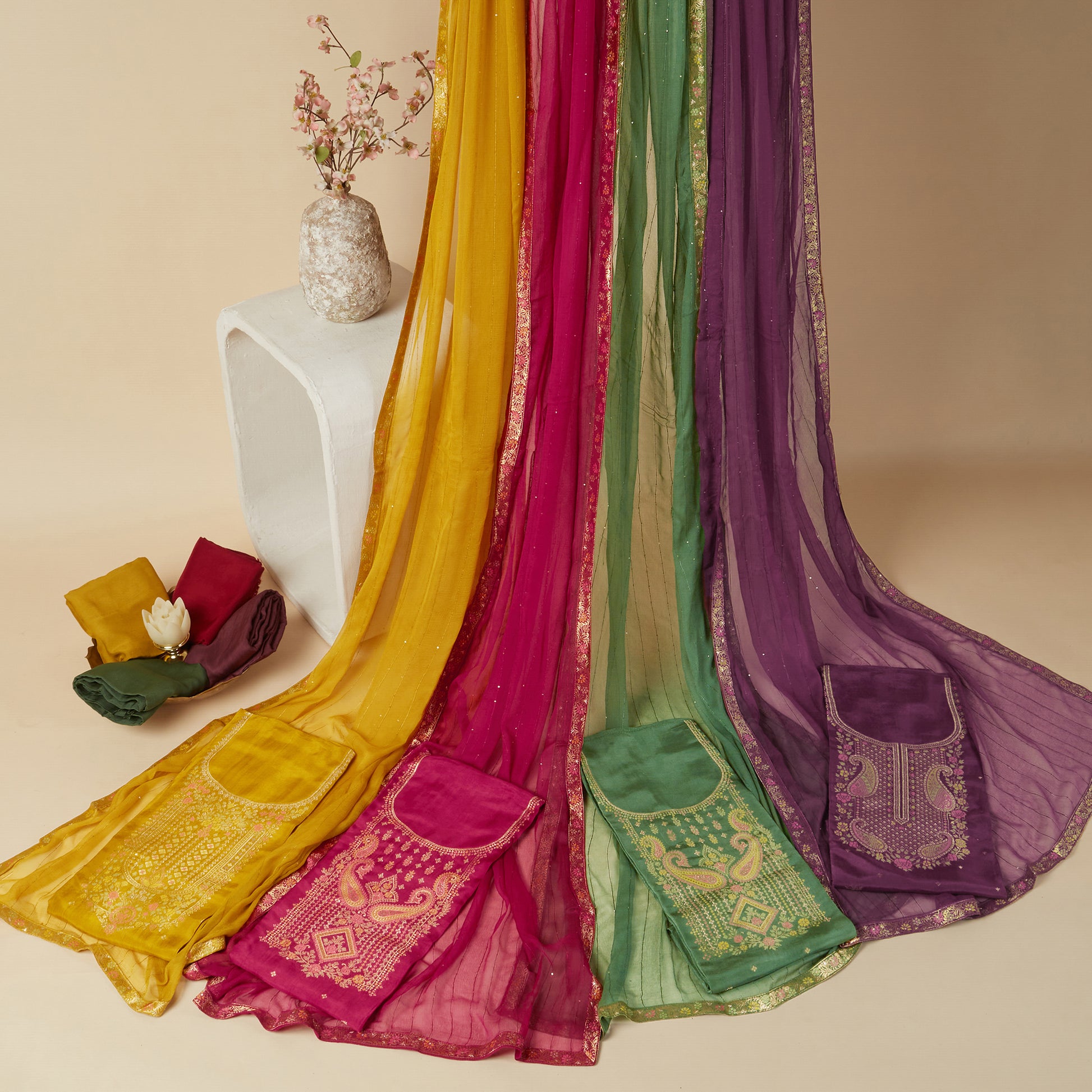 Elevate your look by pairing these Unstitched Suit Set with statement earrings and elegant gold jewelry for a graceful and fashionable appearance. An ethnic outfit goes best with a bindi and gorgeous hair accessories too. Pair it up with flats or heels whichever comforts you and you’re good to go.