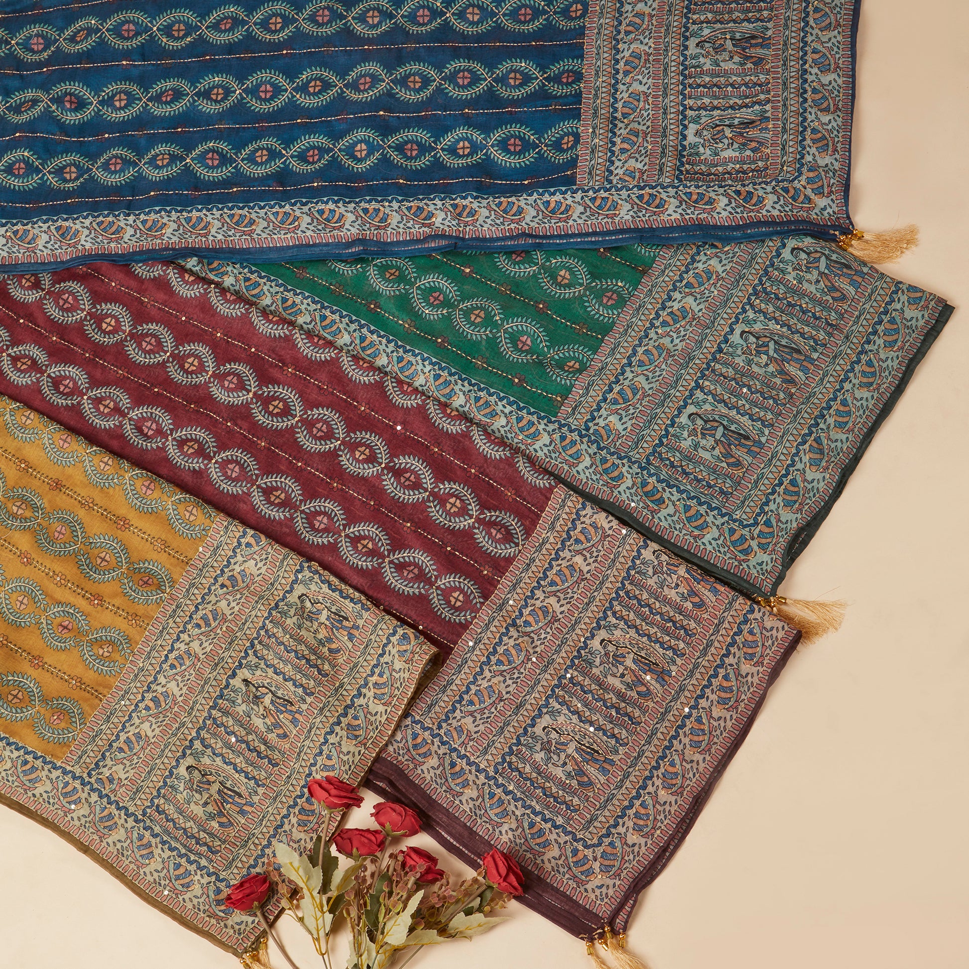 This Chanderi silk suit set is absolutely stunning! The floral Kantha work is done beautifully, and the fabric is soft and breathable. Ideal for weddings or special events.
