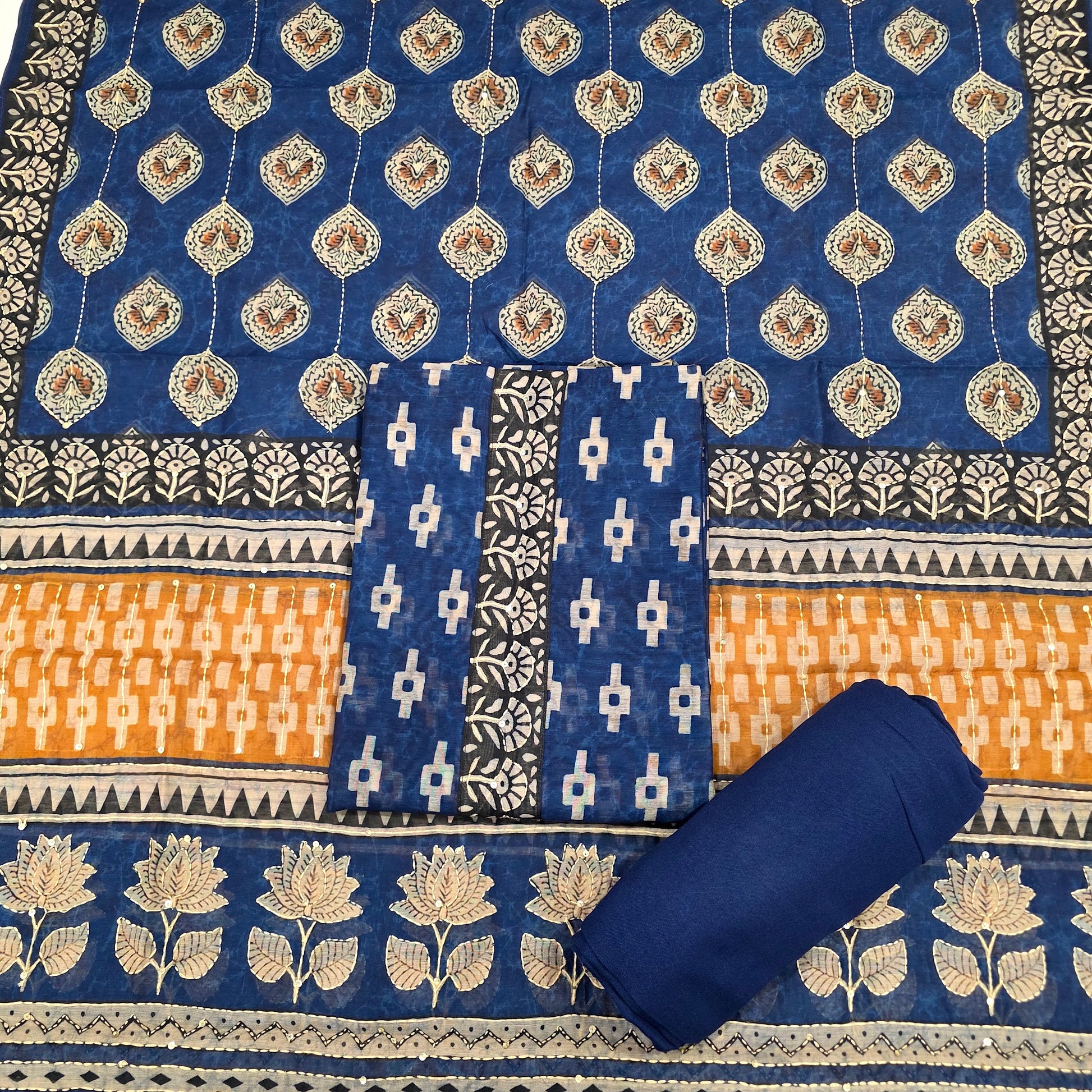 Elevate your look by pairing these Unstitched Suit Set with statement earrings and elegant gold jewelry for a graceful and fashionable appearance. An ethnic outfit goes best with a bindi and gorgeous hair accessories too. Pair it up with flats or heels whichever comforts you and you’re good to go.