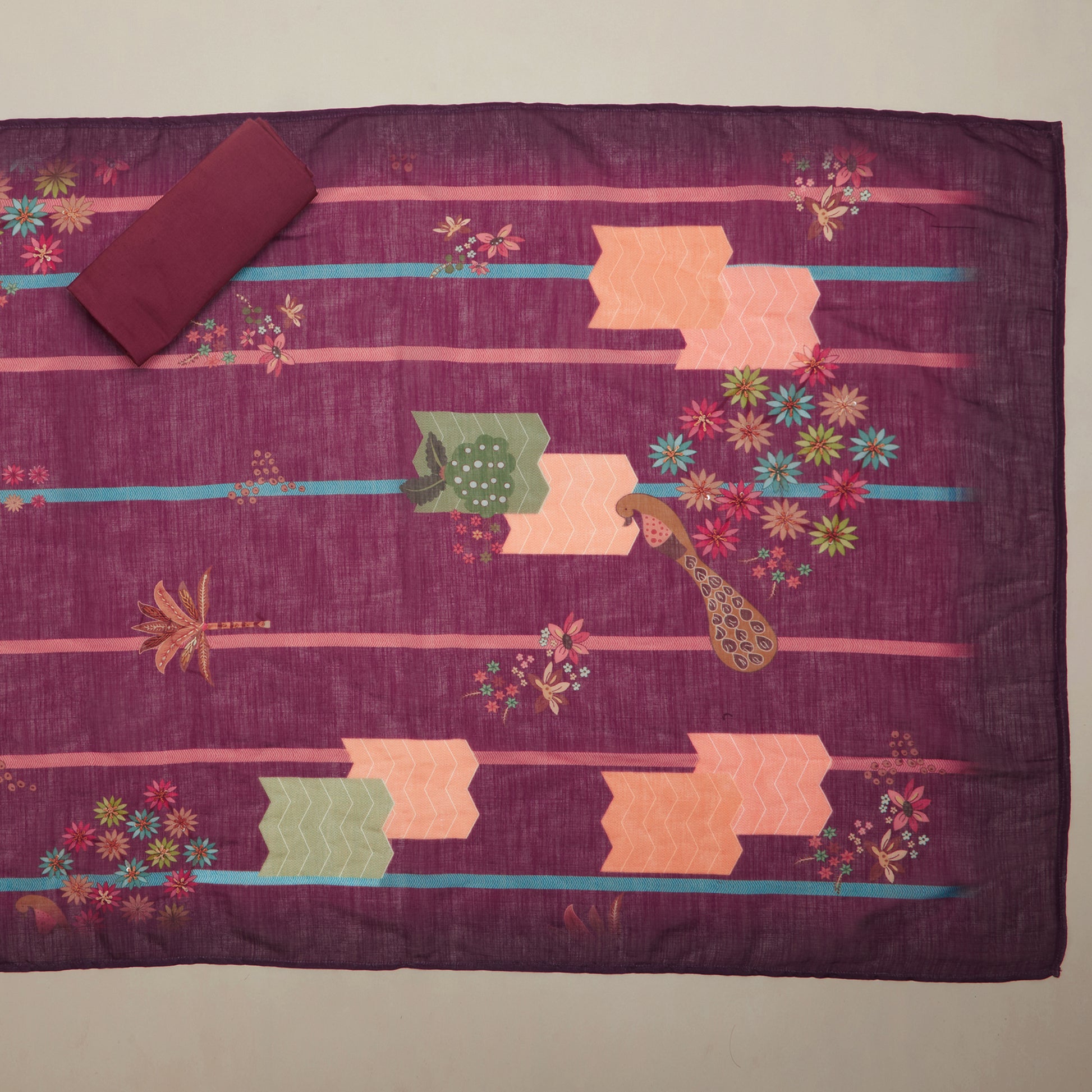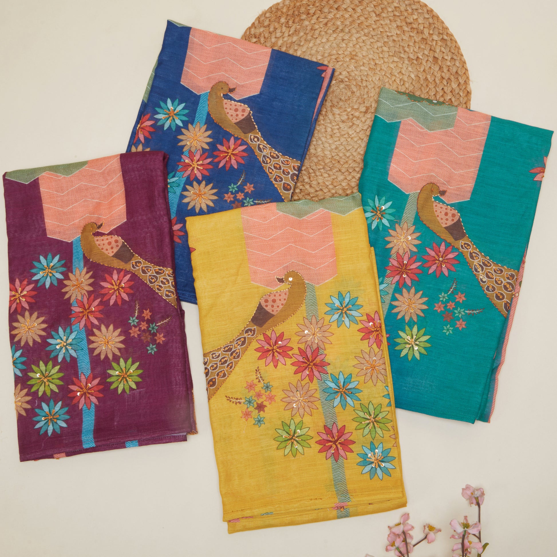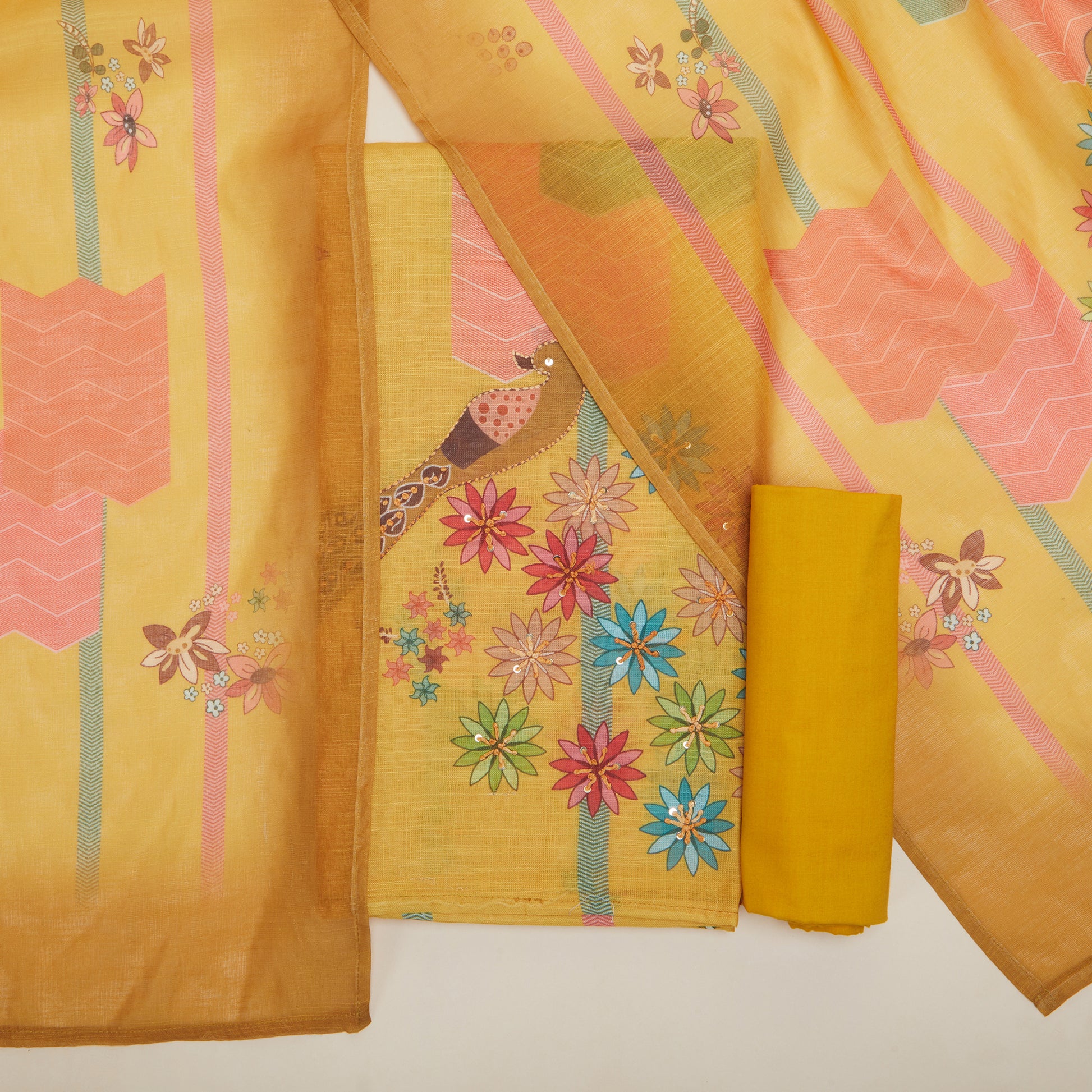 Javer Floral & Peacock Linen Floral French Knots Unstitched Suit Set for Women