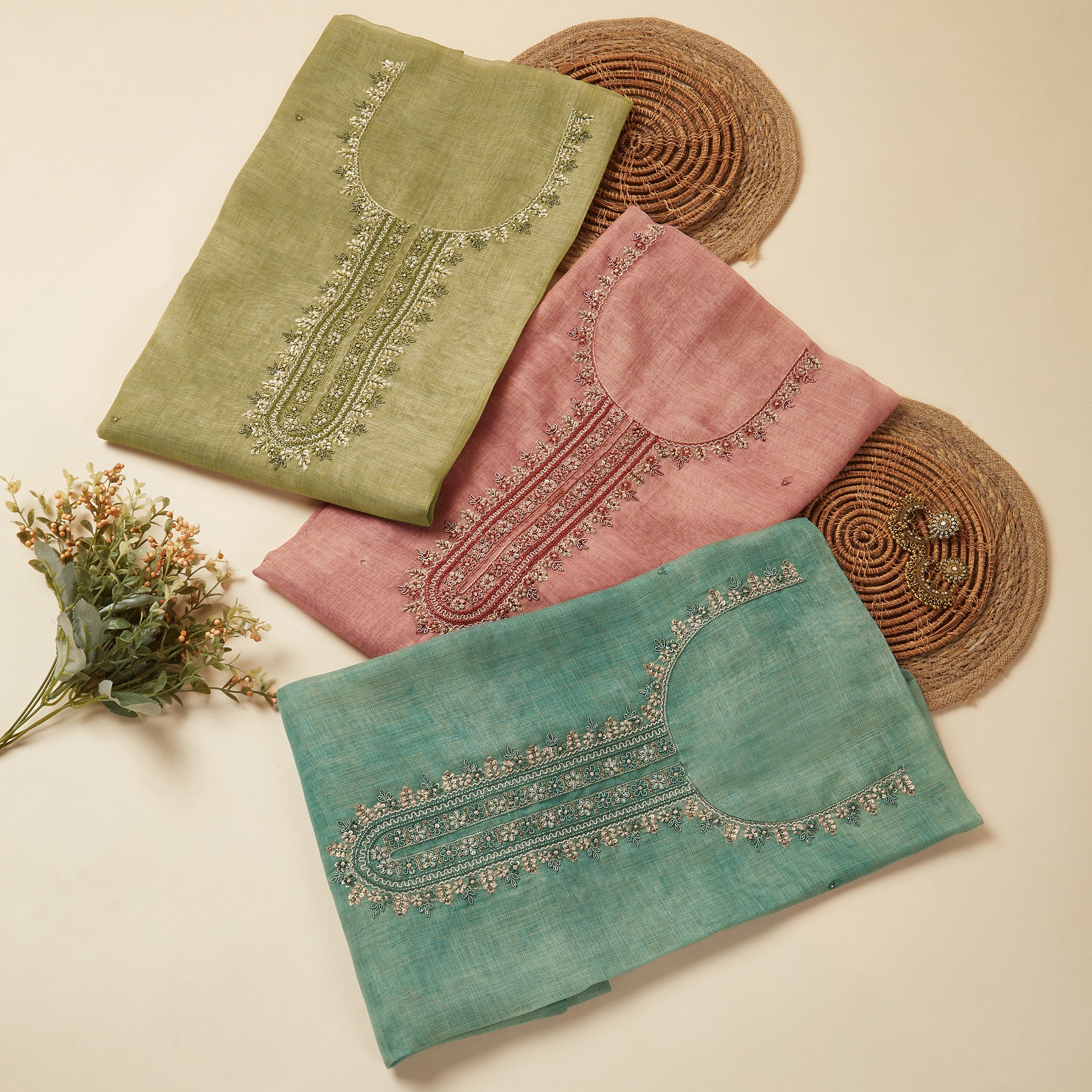 Elevate your look by pairing these Unstitched Suit Set with statement earrings and elegant gold jewelry for a graceful and fashionable appearance. An ethnic outfit goes best with a bindi and gorgeous hair accessories too. Pair it up with flats or heels whichever comforts you and you’re good to go.