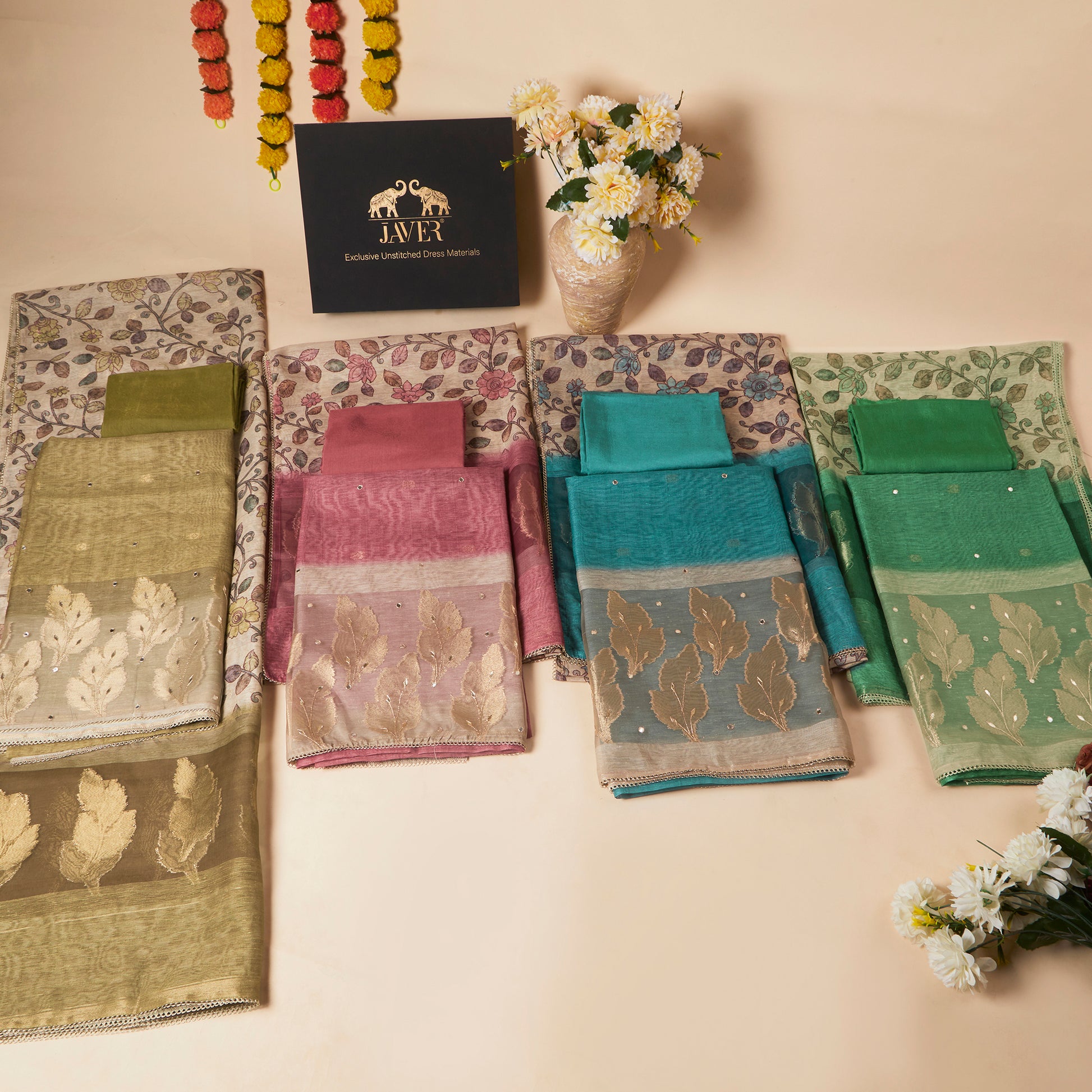 Elevate your look by pairing these Unstitched Suit Set with statement earrings and elegant gold jewelry for a graceful and fashionable appearance. An ethnic outfit goes best with a bindi and gorgeous hair accessories too. Pair it up with flats or heels whichever comforts you and you’re good to go.