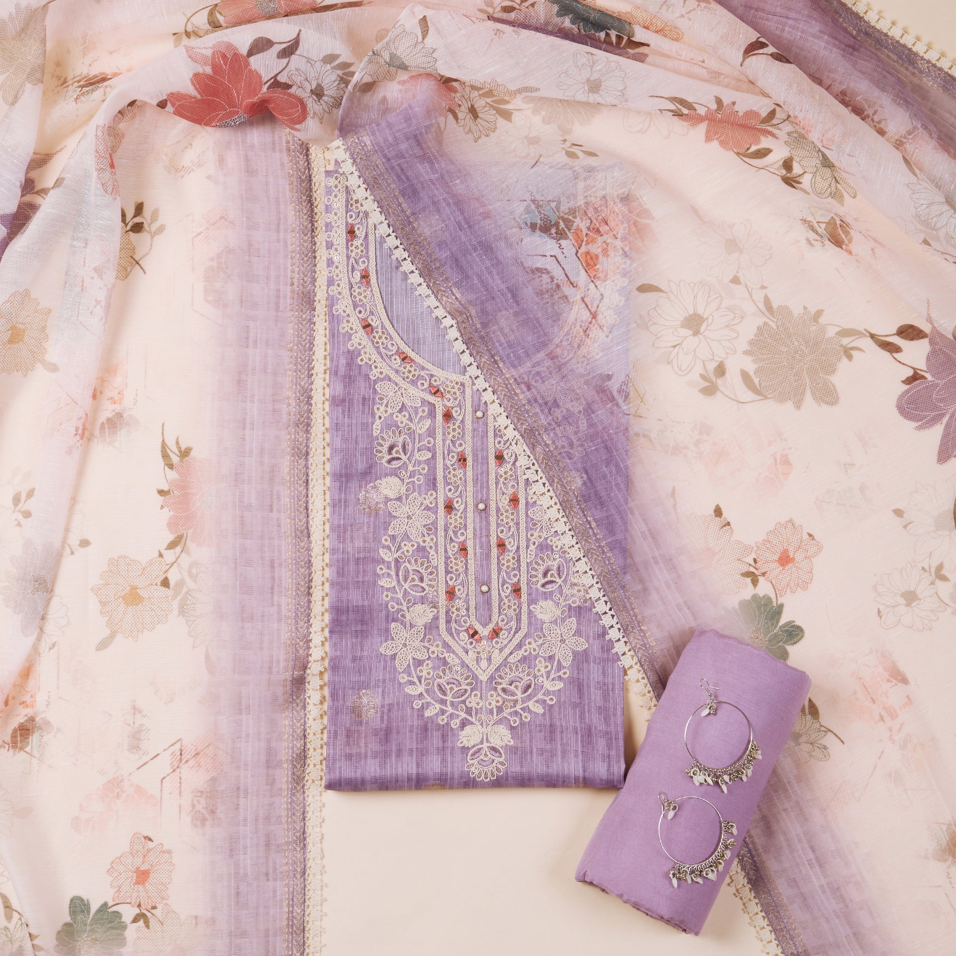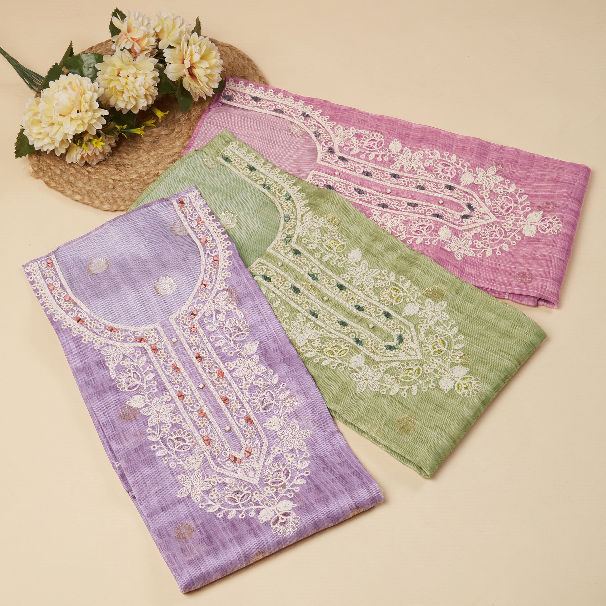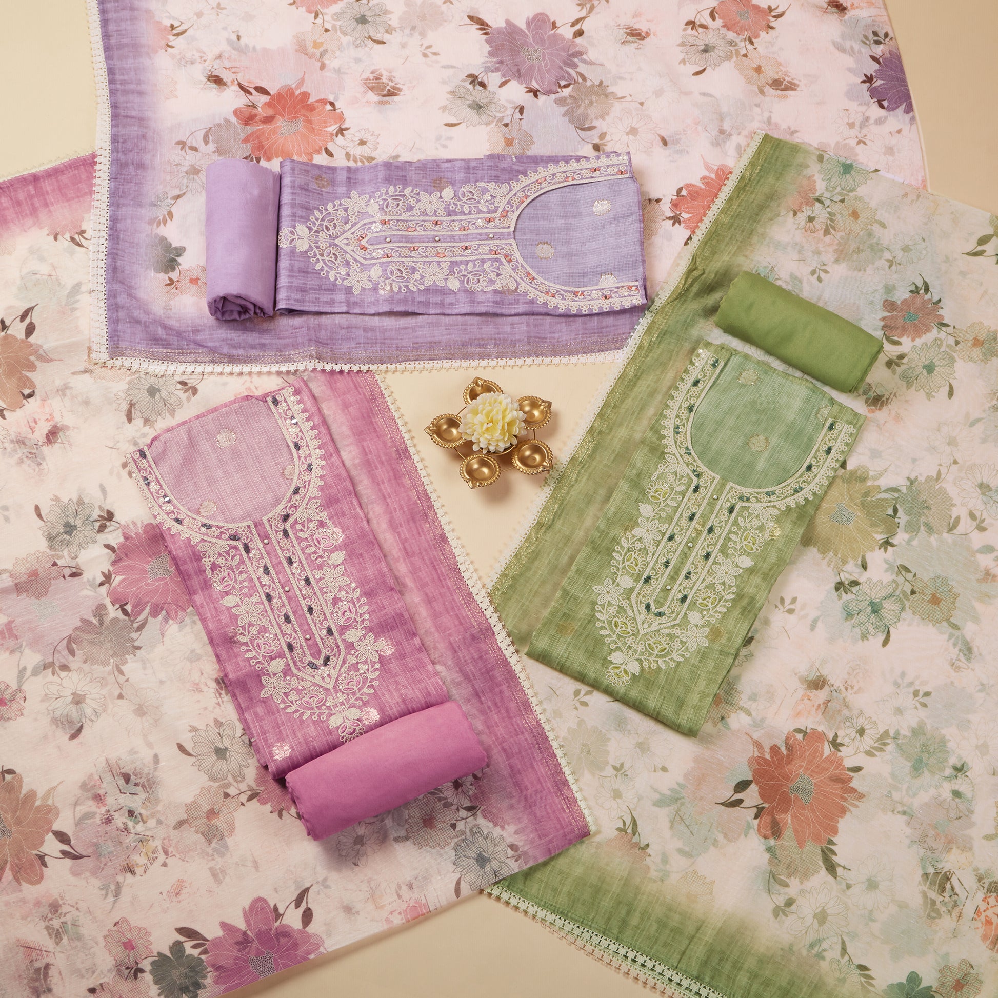 Elevate your look by pairing these Unstitched Suit Set with statement earrings and elegant gold jewelry for a graceful and fashionable appearance. An ethnic outfit goes best with a bindi and gorgeous hair accessories too. Pair it up with flats or heels whichever comforts you and you’re good to go.