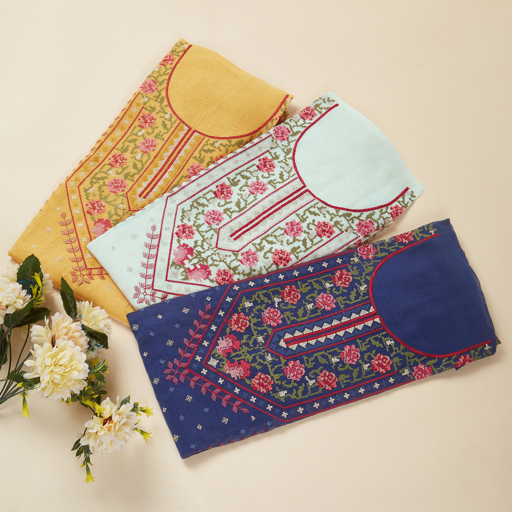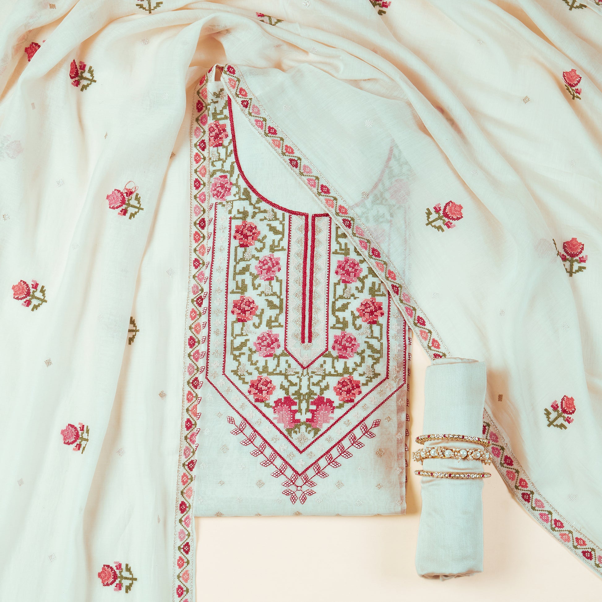 Javer Mul Chanderi Cross-Stitch embroidered Unstitched 3pcs Suit Set for Women