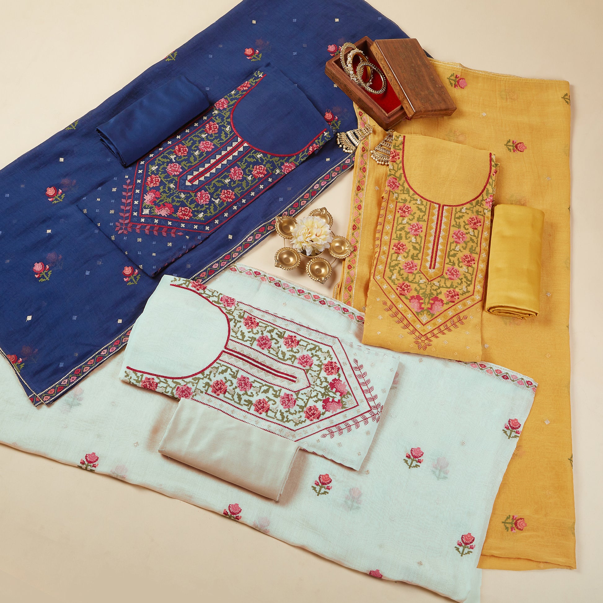 Elevate your look by pairing these Unstitched Suit Set with statement earrings and elegant gold jewelry for a graceful and fashionable appearance. An ethnic outfit goes best with a bindi and gorgeous hair accessories too. Pair it up with flats or heels whichever comforts you and you’re good to go.