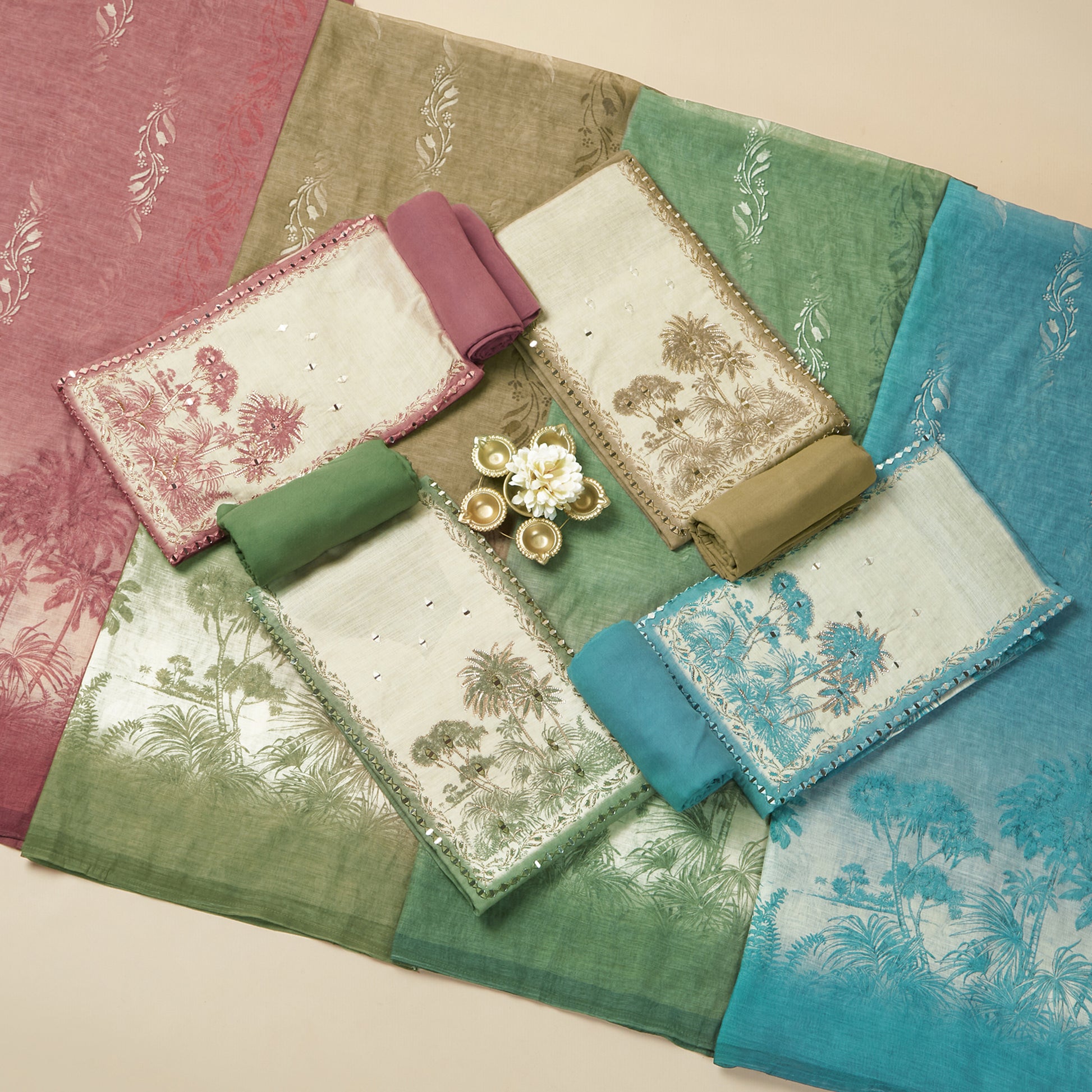 Elevate your look by pairing these Unstitched Suit Set with statement earrings and elegant gold jewelry for a graceful and fashionable appearance. An ethnic outfit goes best with a bindi and gorgeous hair accessories too. Pair it up with flats or heels whichever comforts you and you’re good to go.