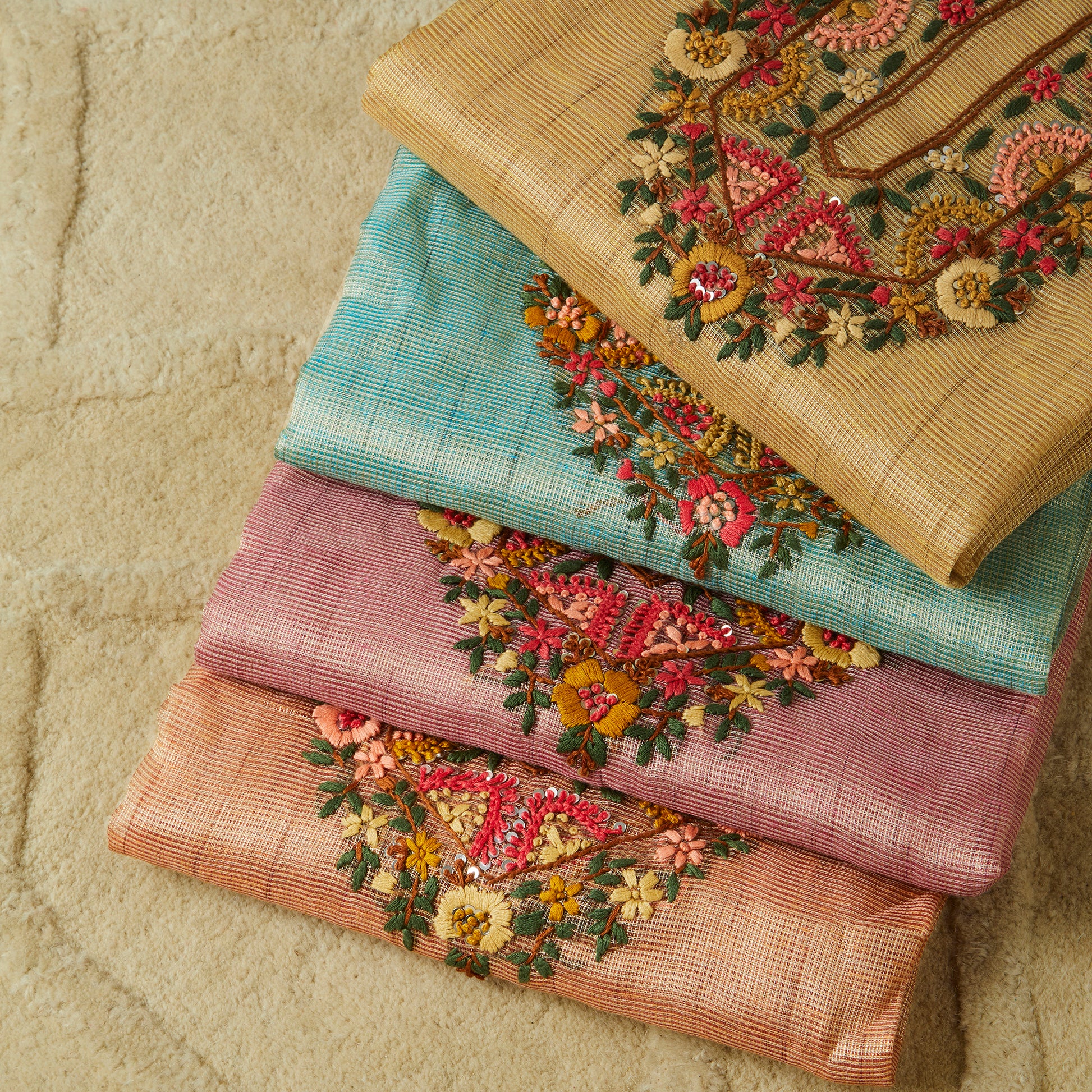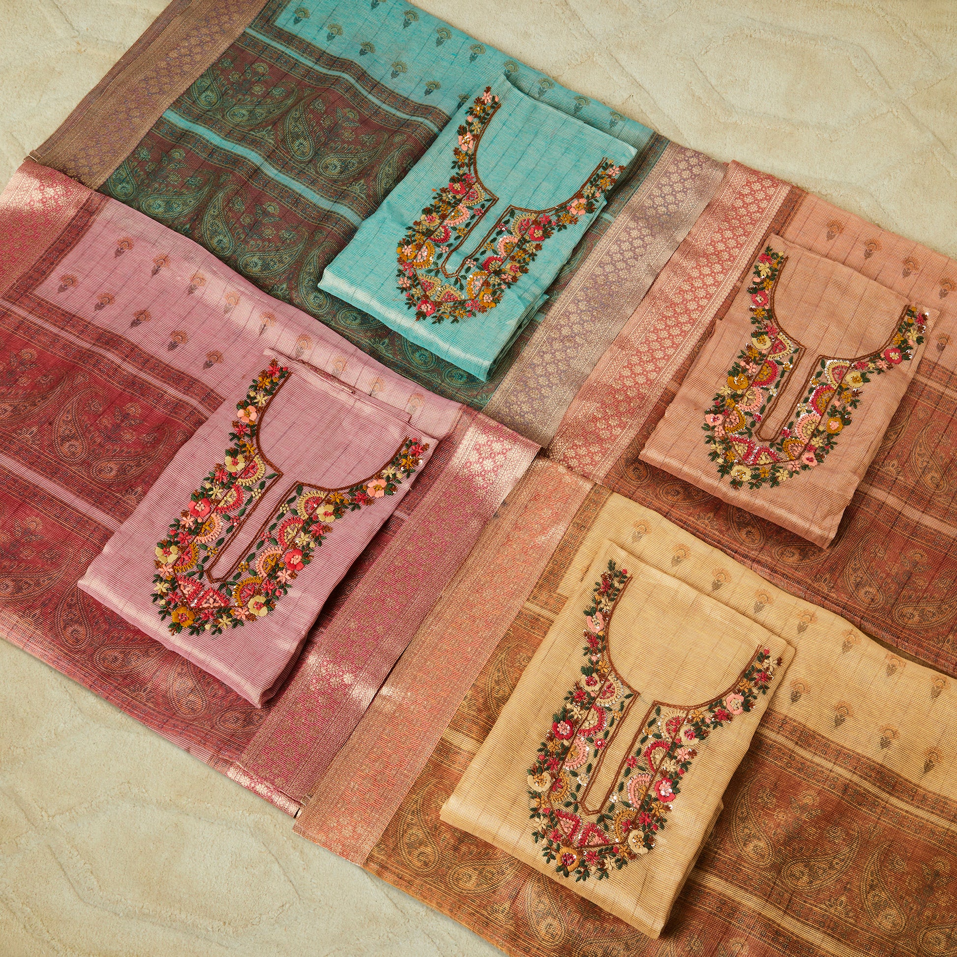Javer Tissue Silk Kantha & French knots hand embroidered Dress Material
