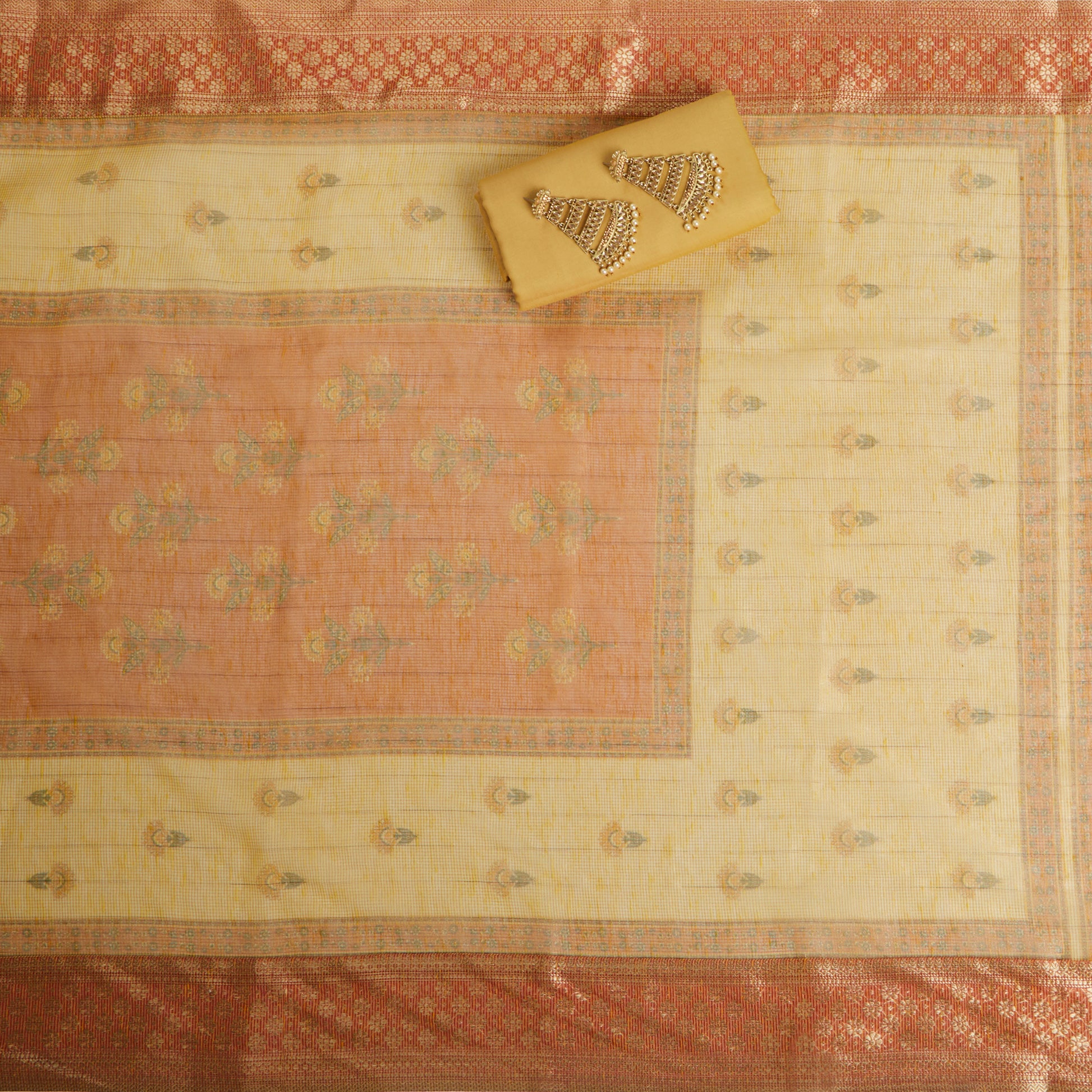 Elevate your look by pairing these Unstitched Suit Set with statement earrings and elegant gold jewelry for a graceful and fashionable appearance. An ethnic outfit goes best with a bindi and gorgeous hair accessories too. Pair it up with flats or heels whichever comforts you and you’re good to go.