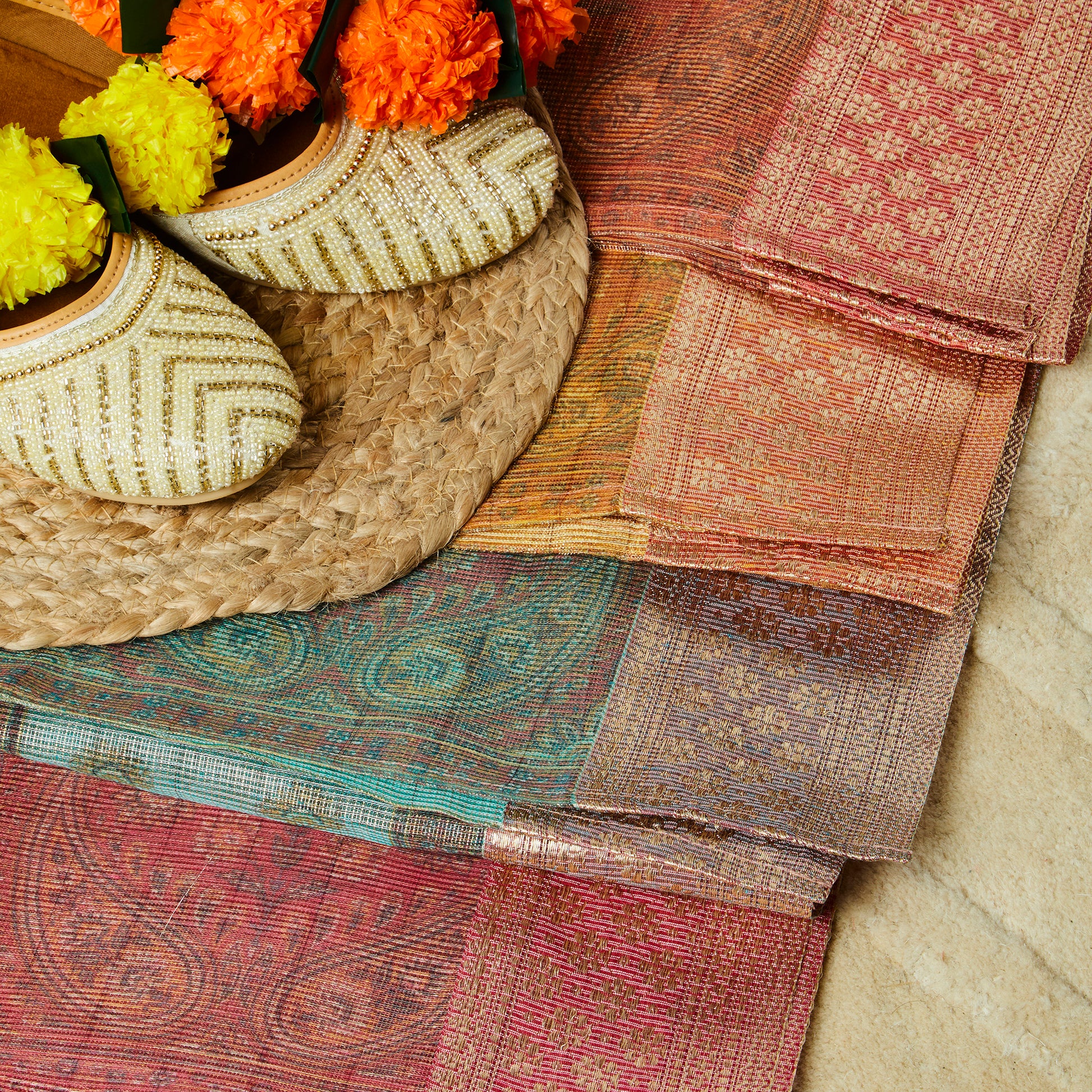 Embrace elegance with our stunning tissue silk fabric adorned with intricate embroidery.