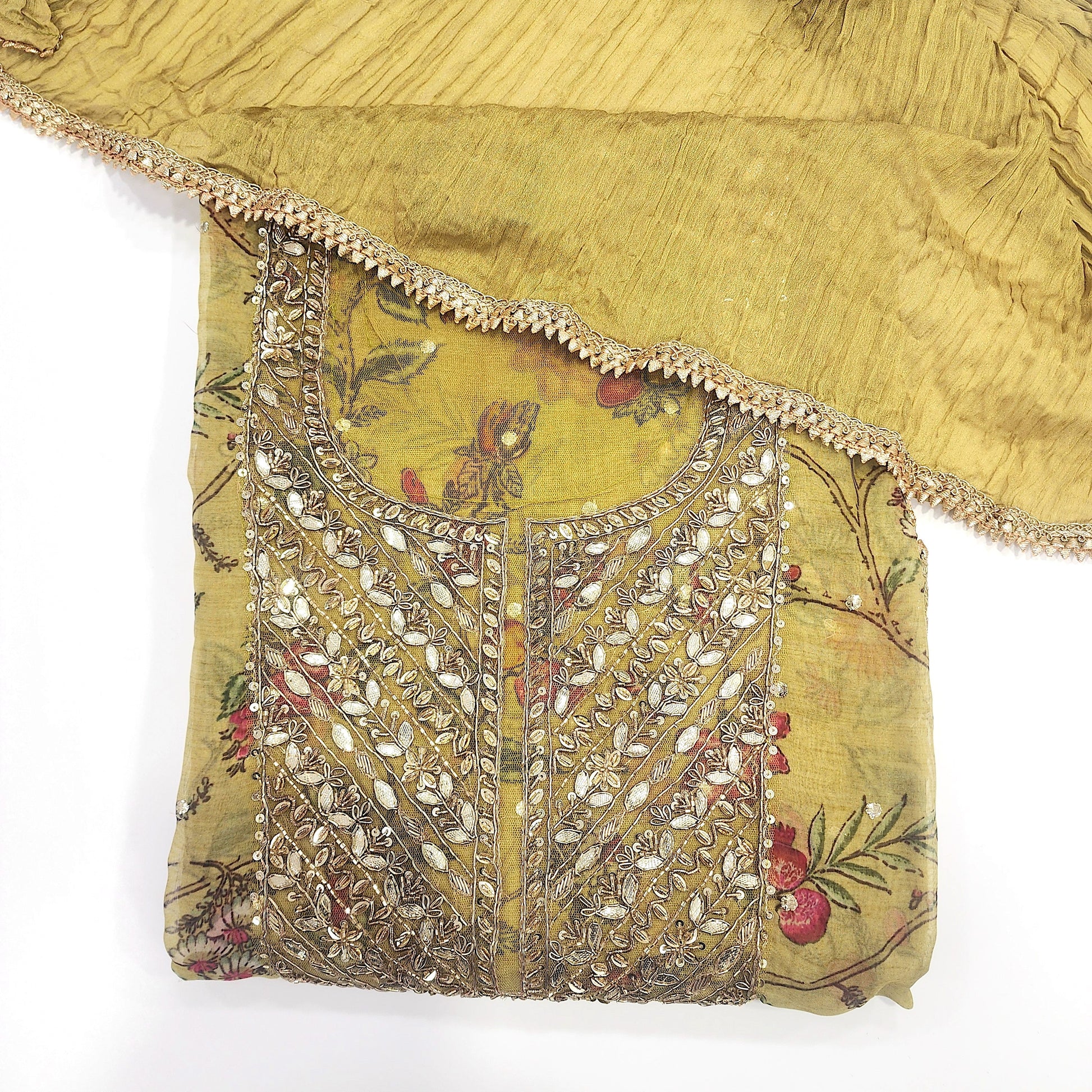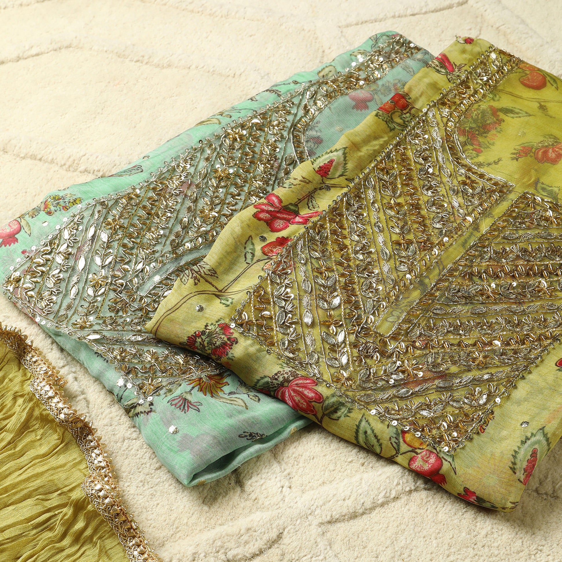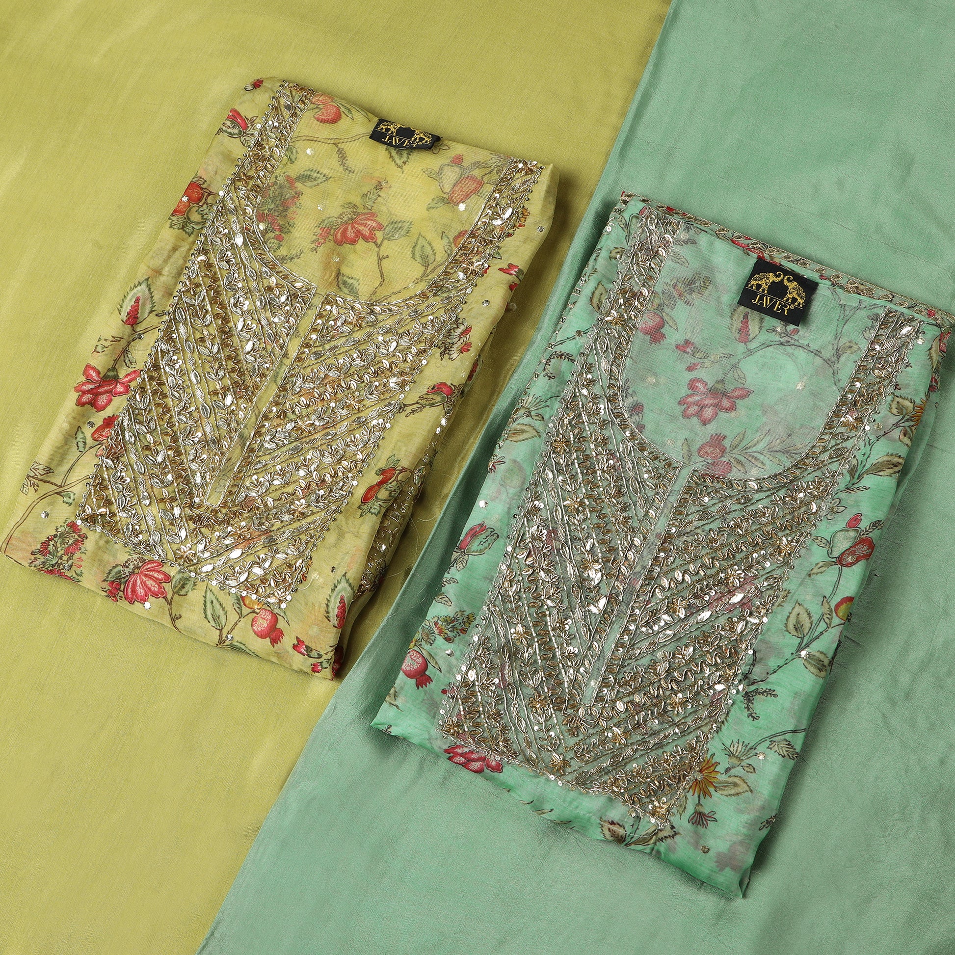 Elevate your look by pairing these Unstitched Suit Set with statement earrings and elegant gold jewelry for a graceful and fashionable appearance. An ethnic outfit goes best with a bindi and gorgeous hair accessories too. Pair it up with flats or heels whichever comforts you and you’re good to go.