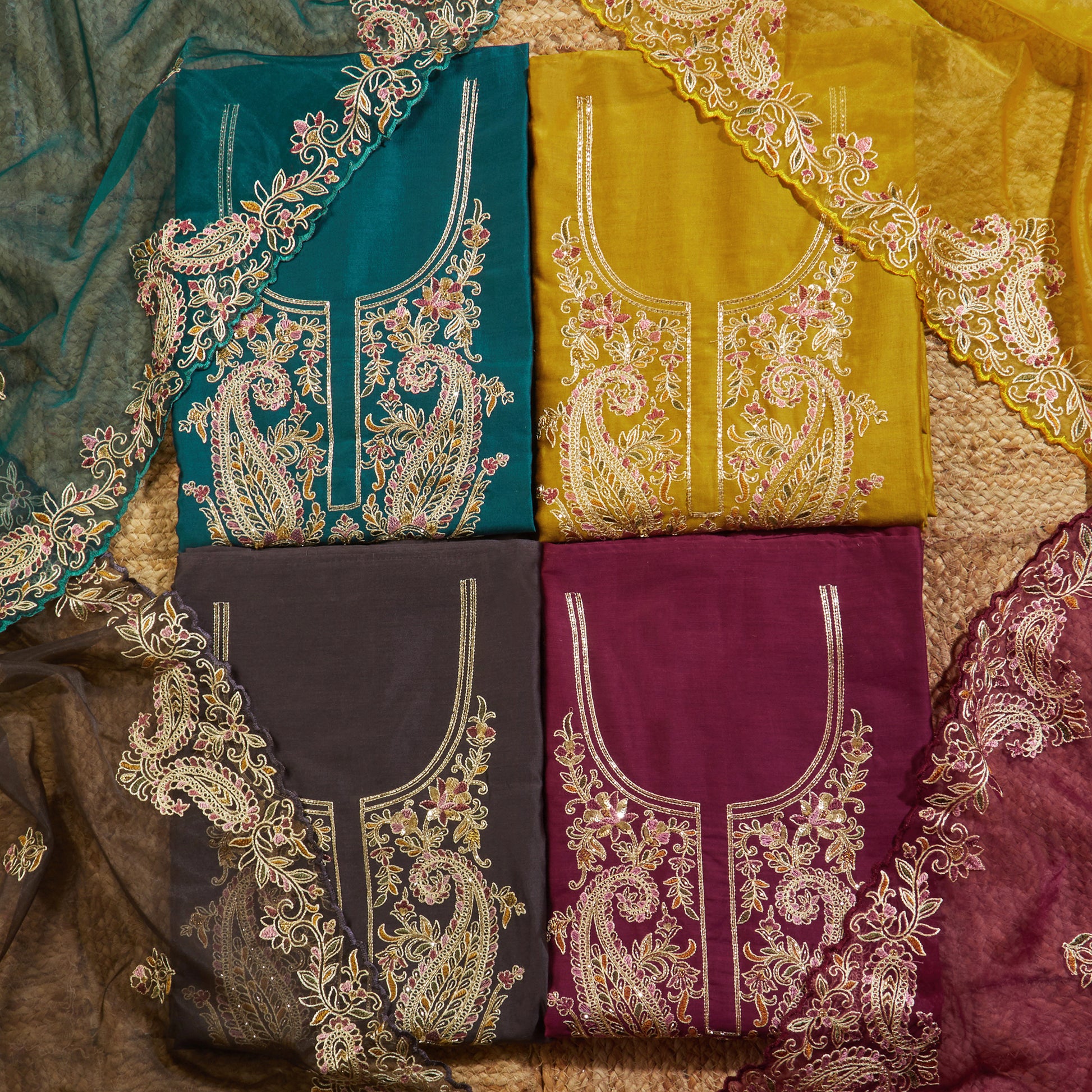 Elevate your look by pairing these Unstitched Suit Set with statement earrings and elegant gold jewelry for a graceful and fashionable appearance. An ethnic outfit goes best with a bindi and gorgeous hair accessories too. Pair it up with flats or heels whichever comforts you and you’re good to go.