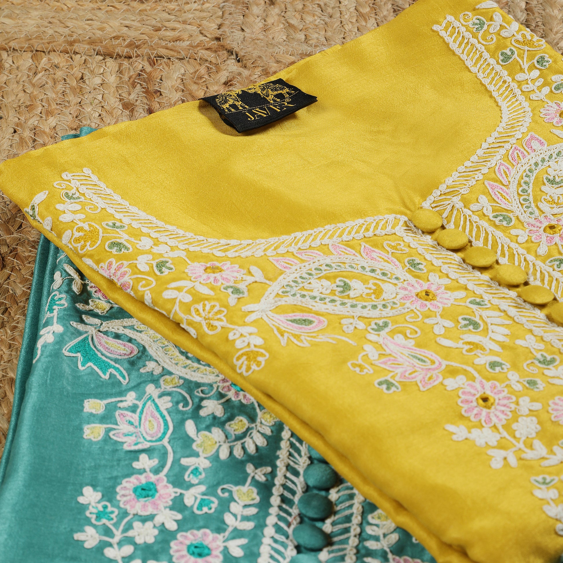 Elevate your look by pairing these Unstitched Suit Set with statement earrings and elegant gold jewelry for a graceful and fashionable appearance. An ethnic outfit goes best with a bindi and gorgeous hair accessories too. Pair it up with flats or heels whichever comforts you and you’re good to go.