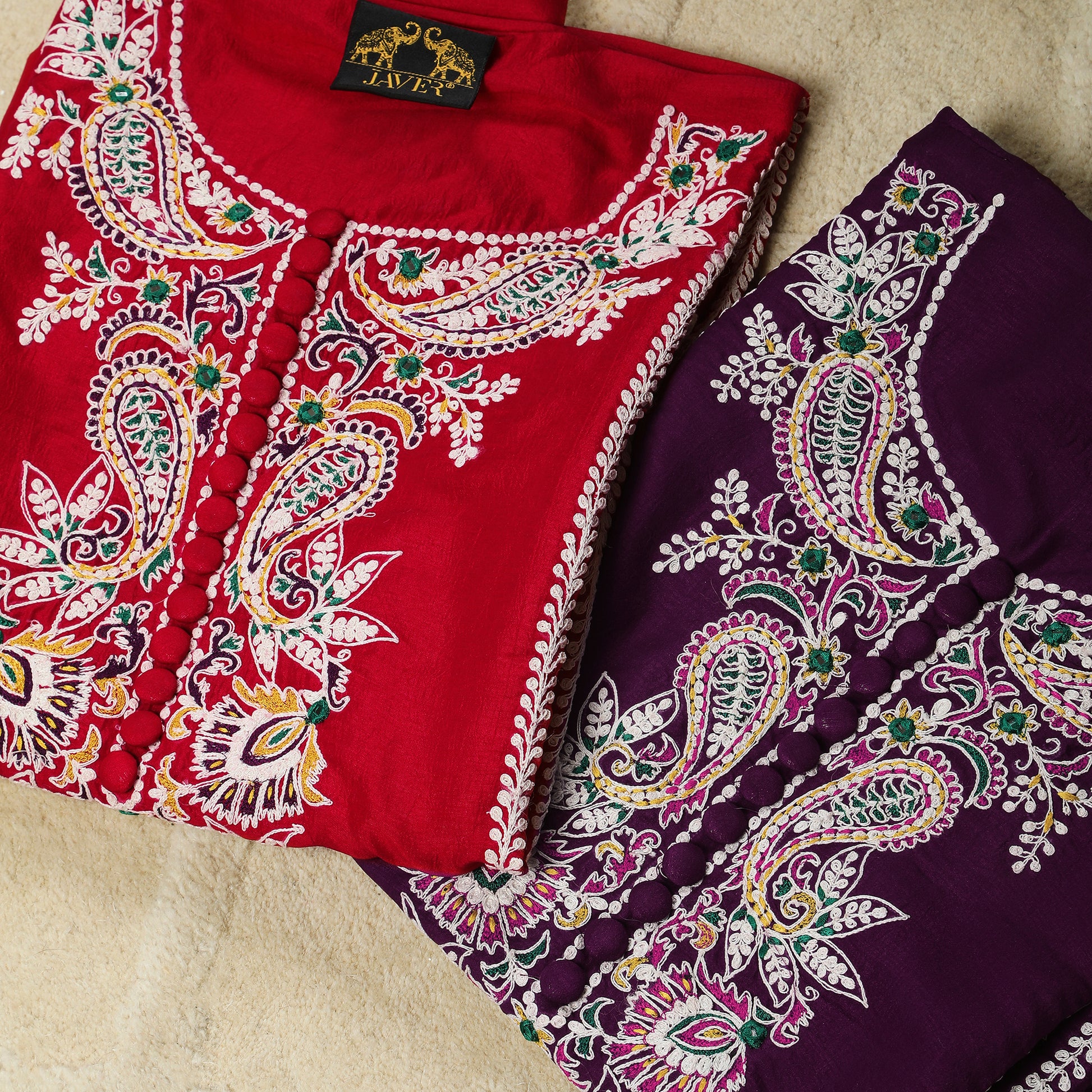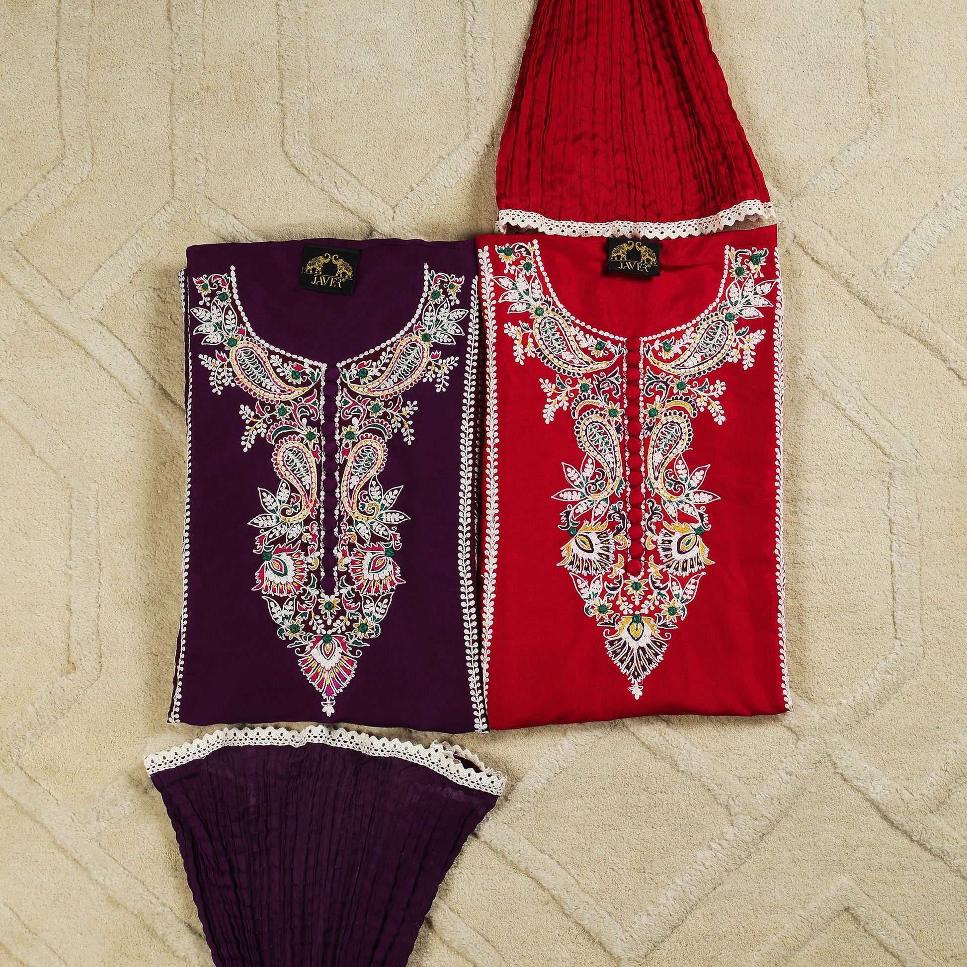 Elevate your look by pairing these Unstitched Suit Set with statement earrings and elegant gold jewelry for a graceful and fashionable appearance. An ethnic outfit goes best with a bindi and gorgeous hair accessories too. Pair it up with flats or heels whichever comforts you and you’re good to go.