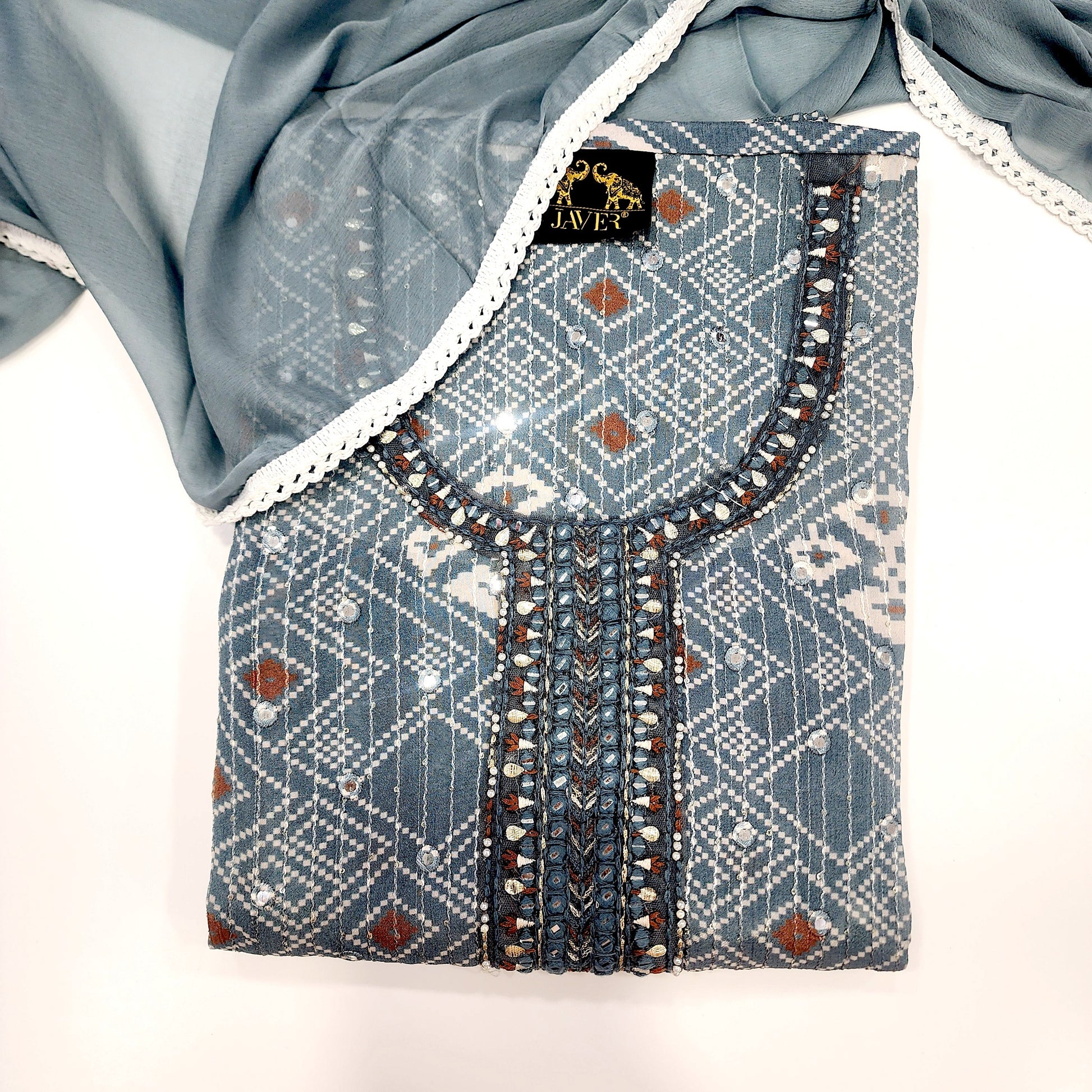 Our Georgette Bandhani print suit set is a must-have for the fashion-forward woman who loves to stand out in a crowd. The vibrant bandhani print and intricate mirror work details make this unstitched suit set a showstopper, perfect for any occasion.