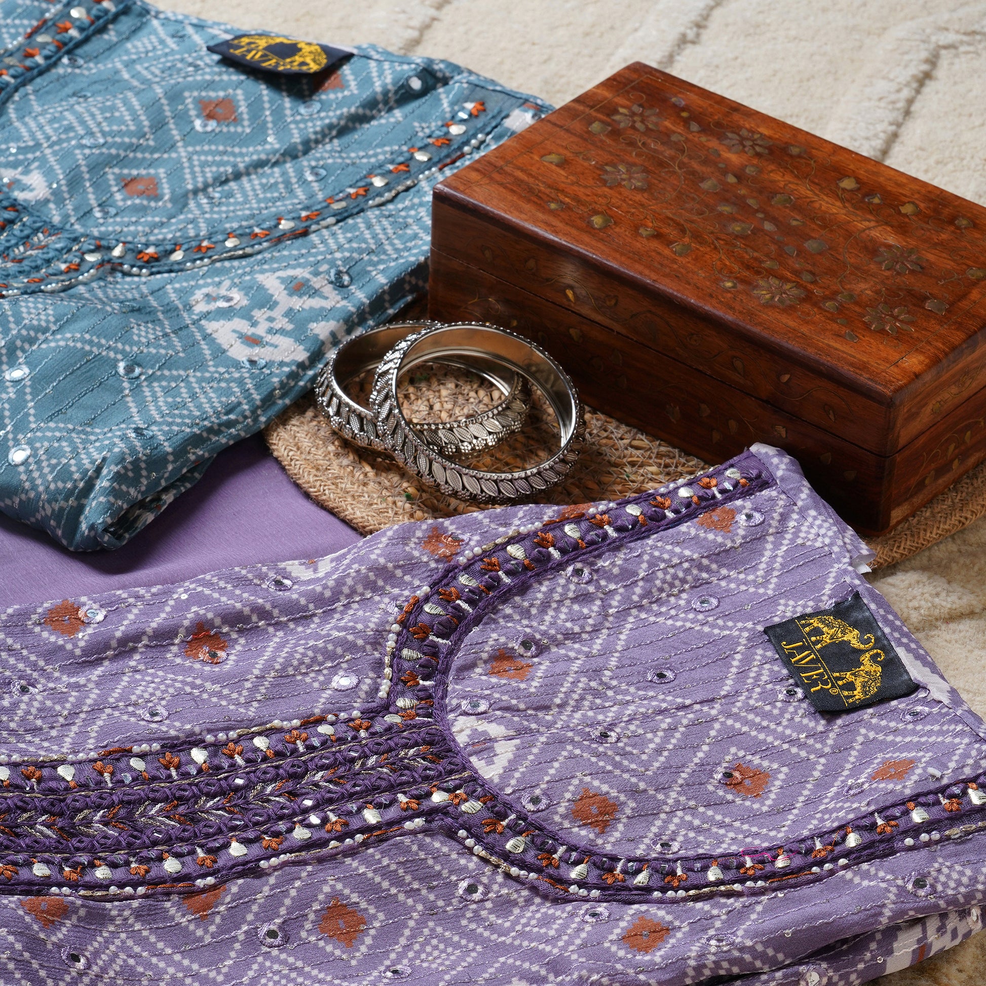 The suit is elegant and eye-catching! The mirror work really stands out, and the Bandhani print is perfect for any celebration.