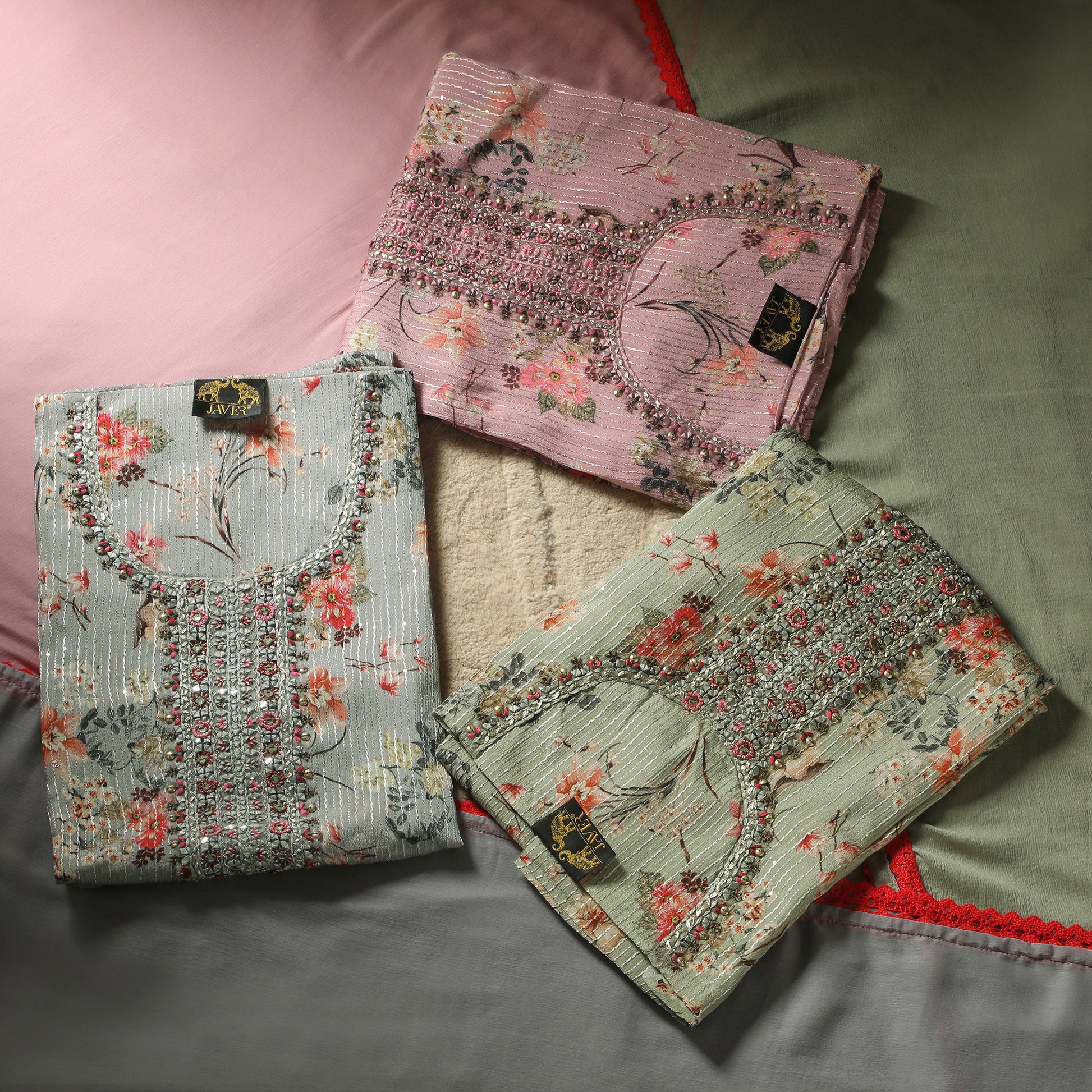 Elevate your look by pairing these Unstitched Suit Set with statement earrings and elegant gold jewelry for a graceful and fashionable appearance. An ethnic outfit goes best with a bindi and gorgeous hair accessories too. Pair it up with flats or heels whichever comforts you and you’re good to go.