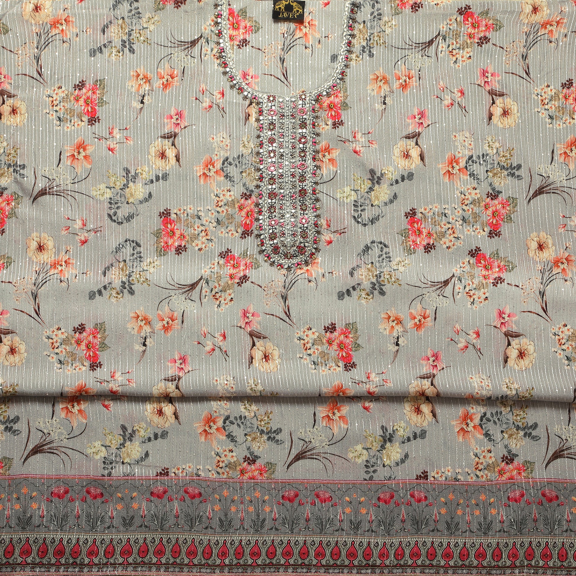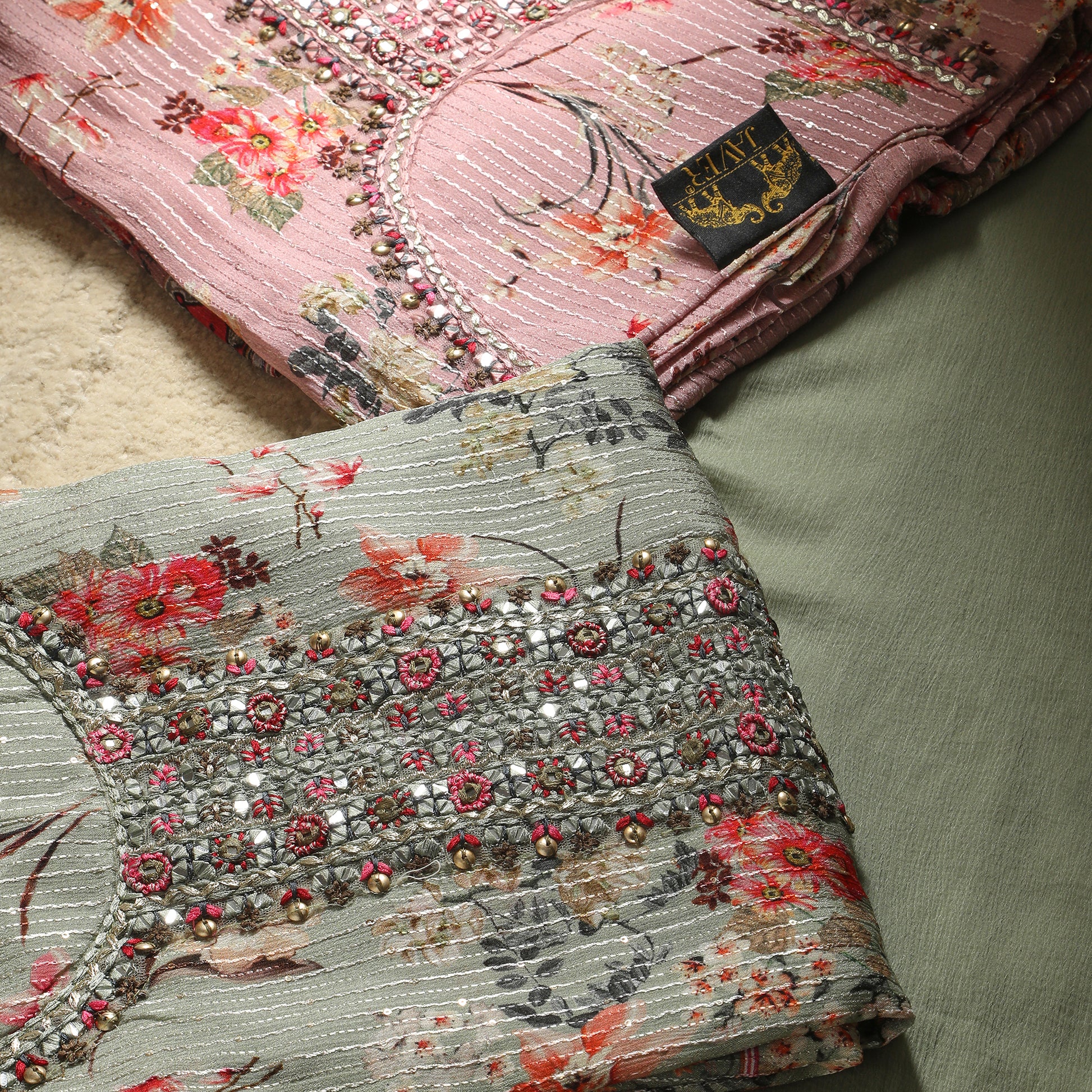 Elevate your style with Javer's Georgette Suit Set, featuring a beautiful floral print and intricate mirror work. Perfect for any occasion, this unstitched suit set allows for a custom fit that will make you stand out in every crowd.