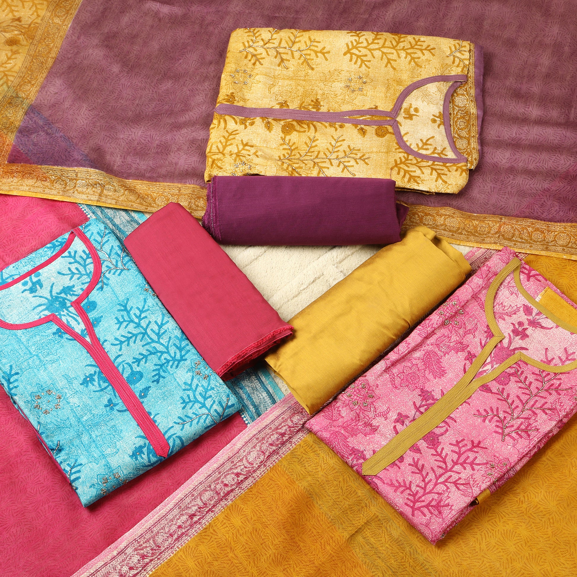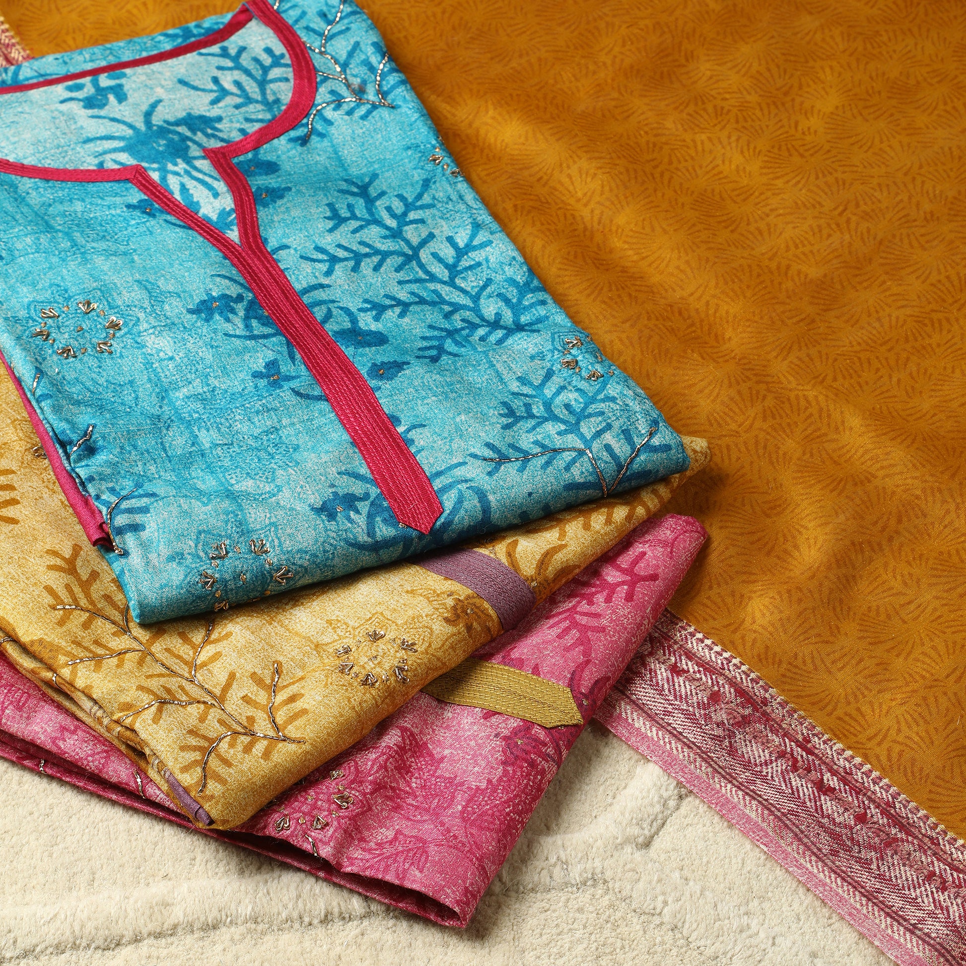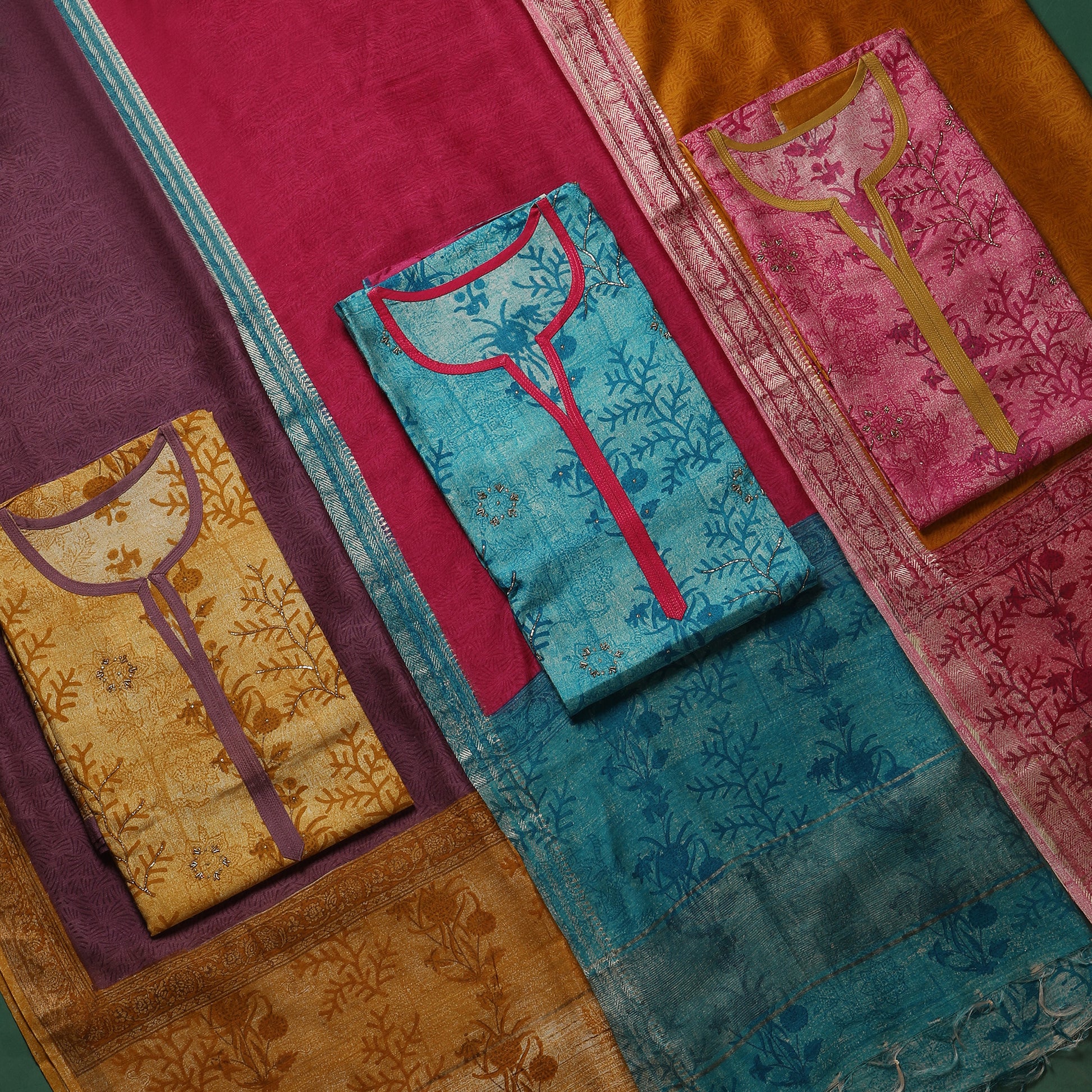 Javer Unstitched Suit Set for Women - Vibrant Tussar Silk Block Print Sequence