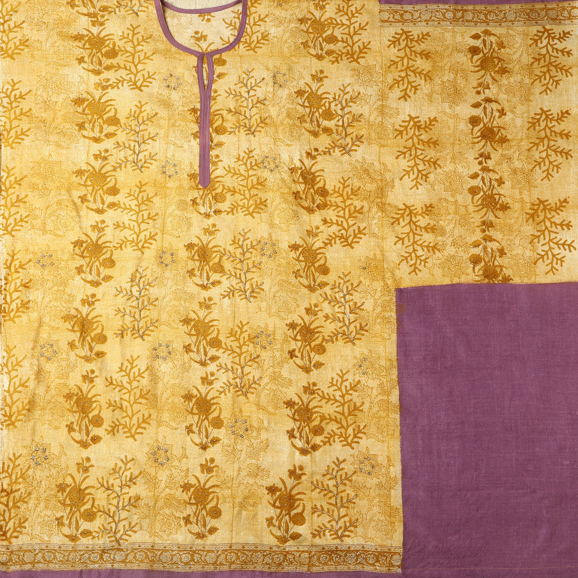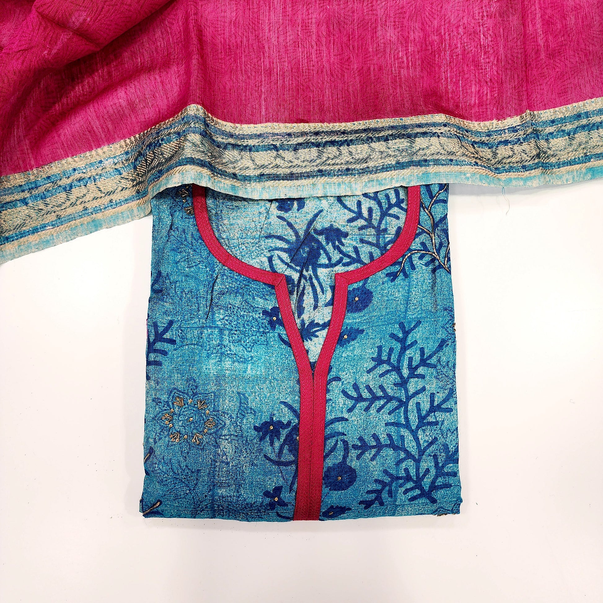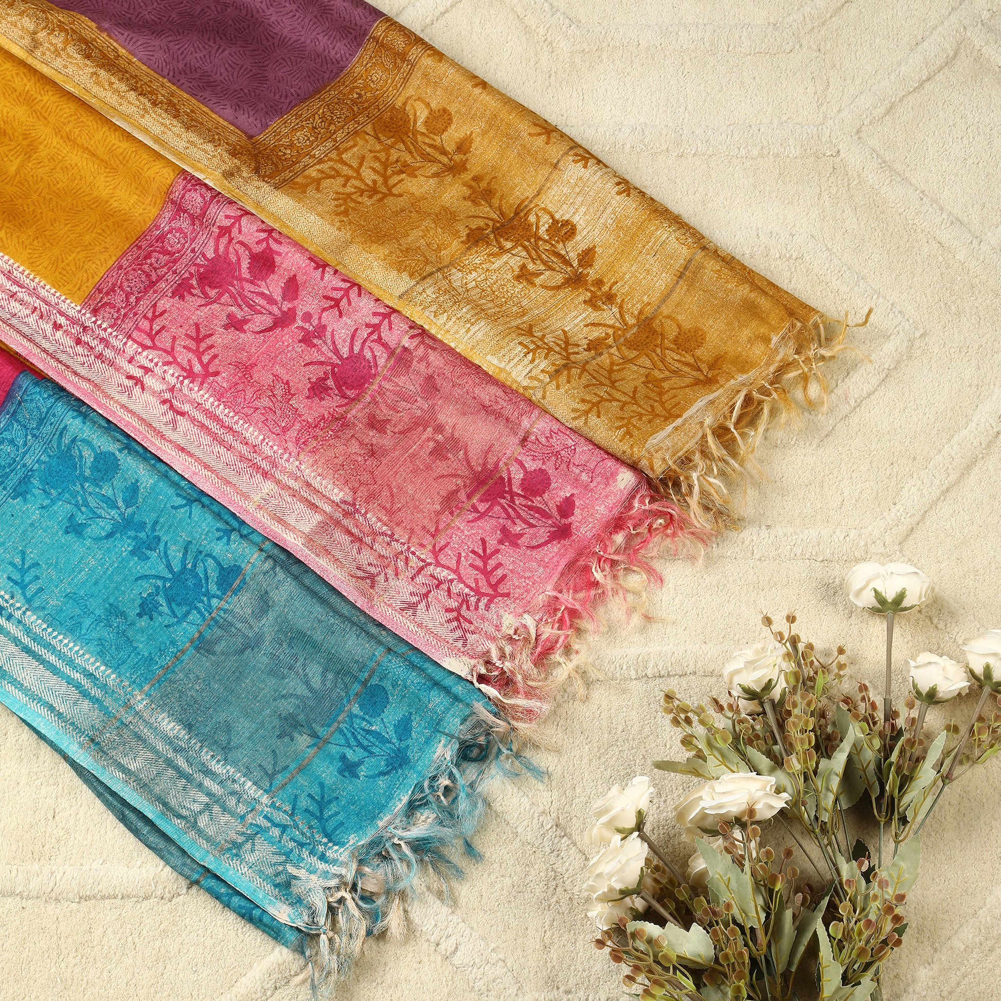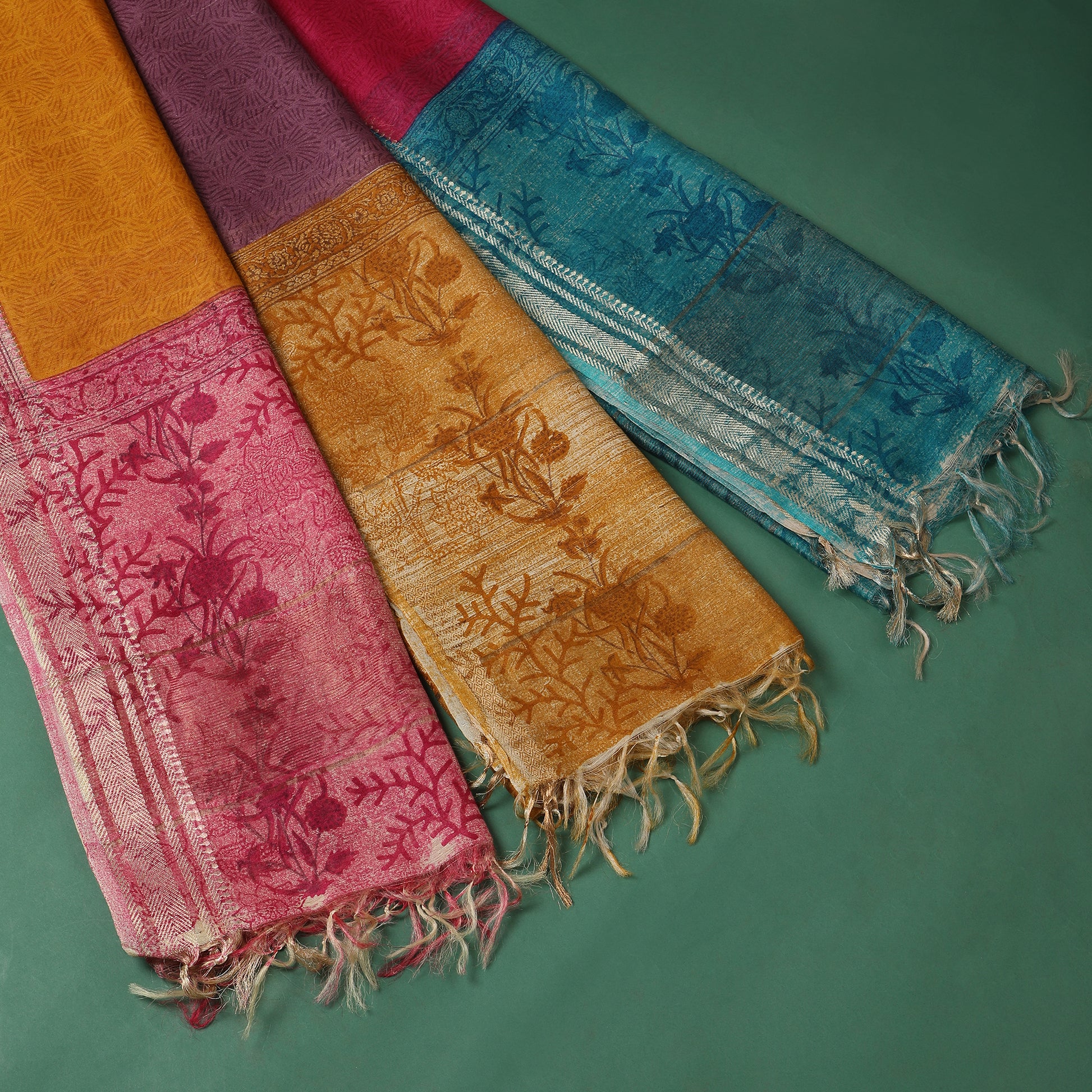 Javer Unstitched Suit Set for Women - Vibrant Tussar Silk Block Print Sequence