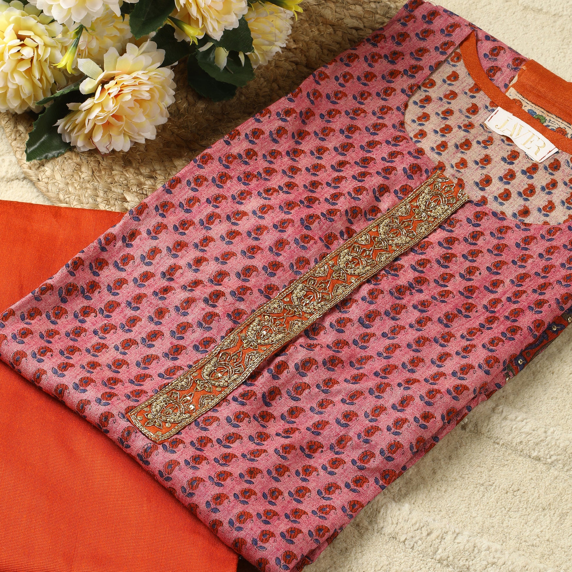 Elevate your ethnic wardrobe with the Javer Tussar Silk Pink Zari Work Unstitched Suit Set. Crafted from high-quality tussar silk, this stunning ensemble is adorned with intricate zari work, making it perfect for special occasions and celebrations.